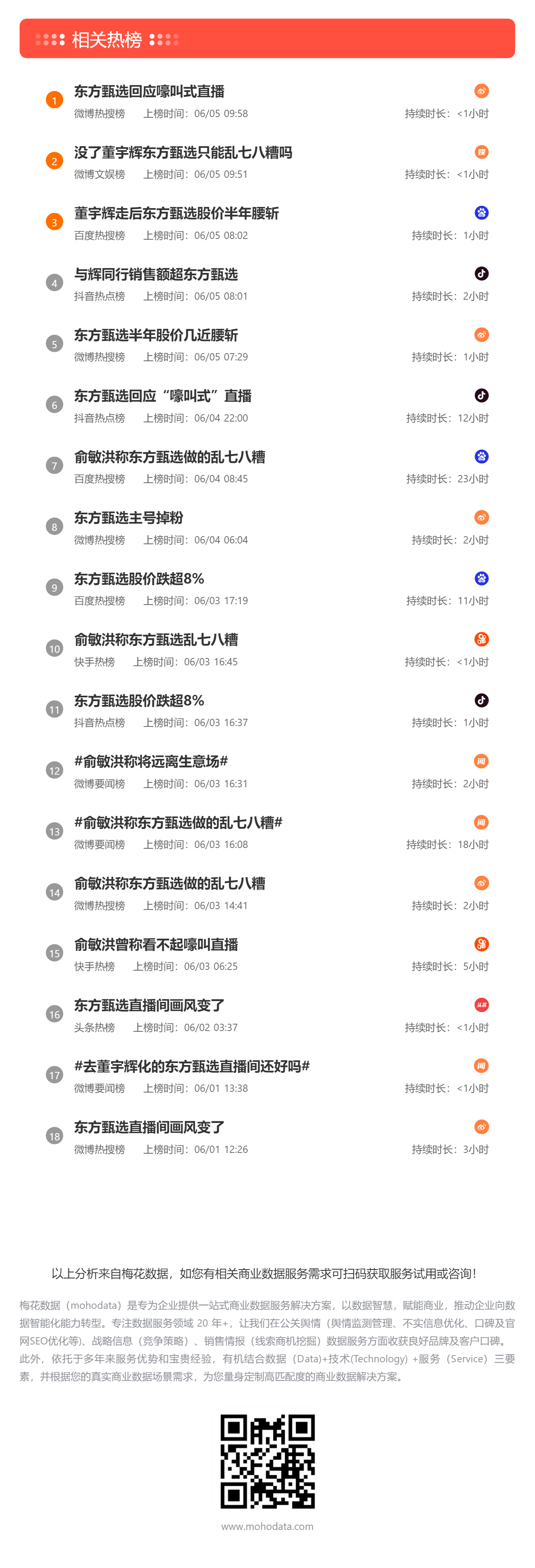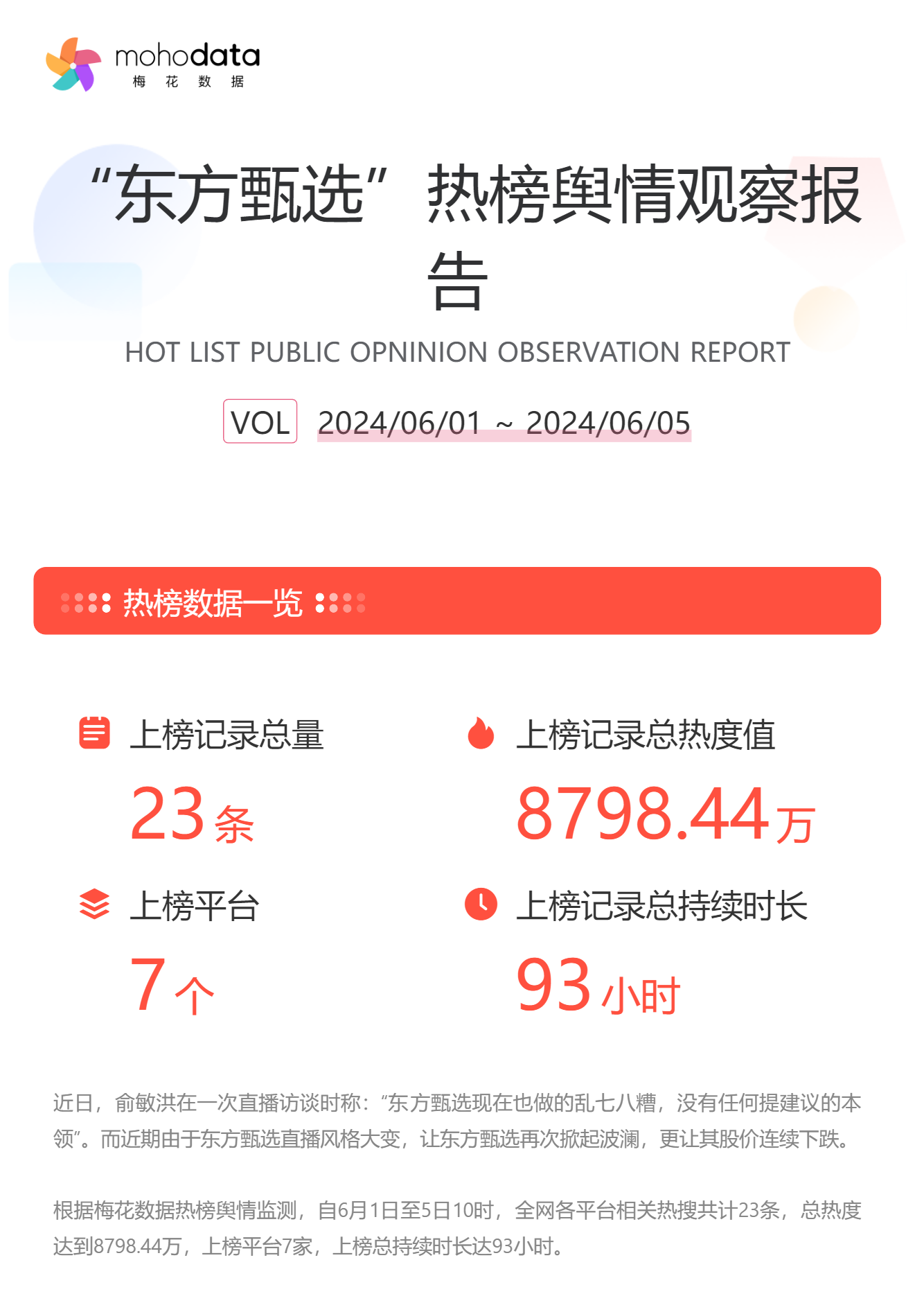 近日,俞敏洪在一次直播访谈时称:“东方甄选现在也做的乱七八糟,没有任何提建议的本领”。而近期由于东方甄选直播风格大变,让东方甄选再次掀起波澜,更让其股价连续下跌。根据梅花数据热榜舆情监测,自6月1日至5日10时,全网各平台相关热搜共计23条,总热度达到8798.44万,上榜平台7家,上榜总持续时长达93小时。