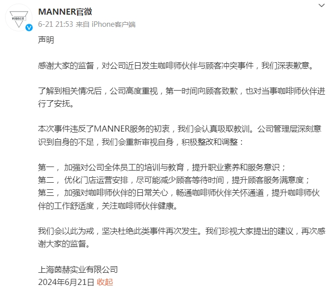 manner在声明中称,接下来将加强对公司全体员工的培训与教育,提升职业素养和服务意识;优化门店运营安排,尽可能减少顾客等待时间,提升顾客服务满意度;加强对咖啡师伙伴的日常关心,畅通咖啡师伙伴关怀通道,提升咖啡师伙伴的工作舒适度,关注咖啡师伙伴健康。
