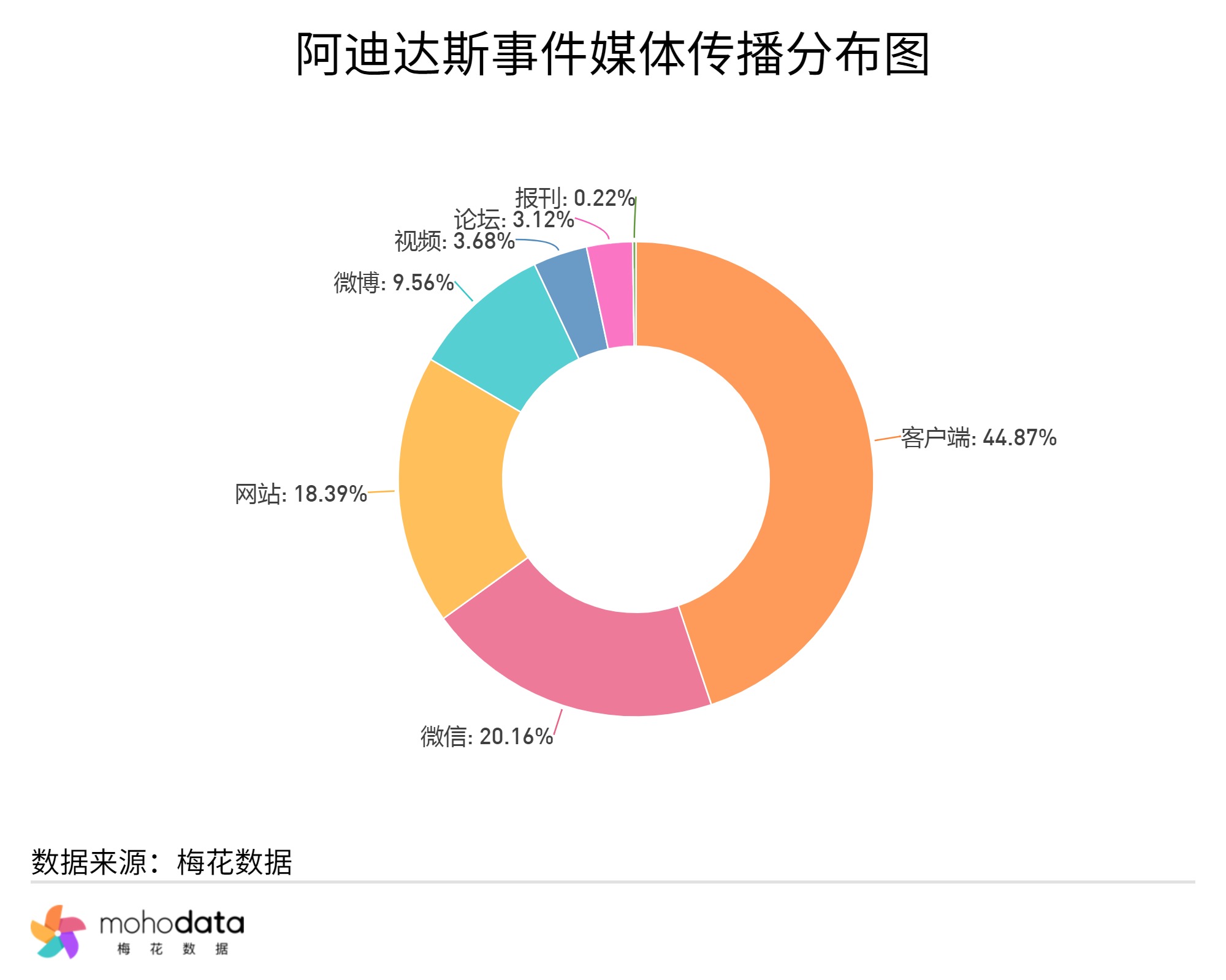 其中信息来源分布图如下图所示,声量主要集中在客户端,客户端占比44.87%,微信占比20.16%,网站占比18.39%,其他信息来源占比不超过10%。