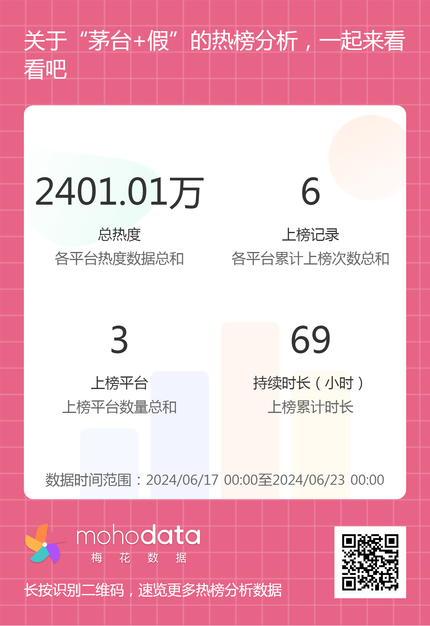 热搜方面,此次茅台事件相关热搜热度总计2401.01万,上榜记录6次,上榜平台3家,持续时长69小时。详情可扫描以下二维码查看。