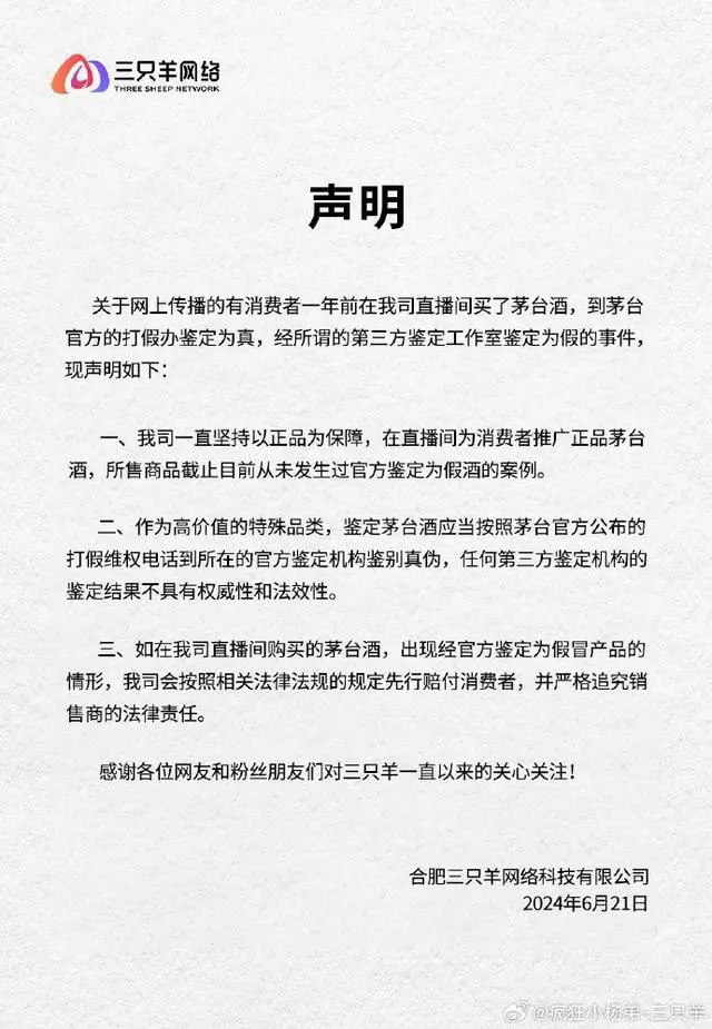 对此,疯狂小杨哥背后的三只羊网络6月21日发布声明称,鉴定茅台酒应当按照茅台官方公布的打假维权电话到所在地官方鉴定机构鉴别真伪,任何第三方鉴定机构的鉴定结果不具有权威性和法效性。