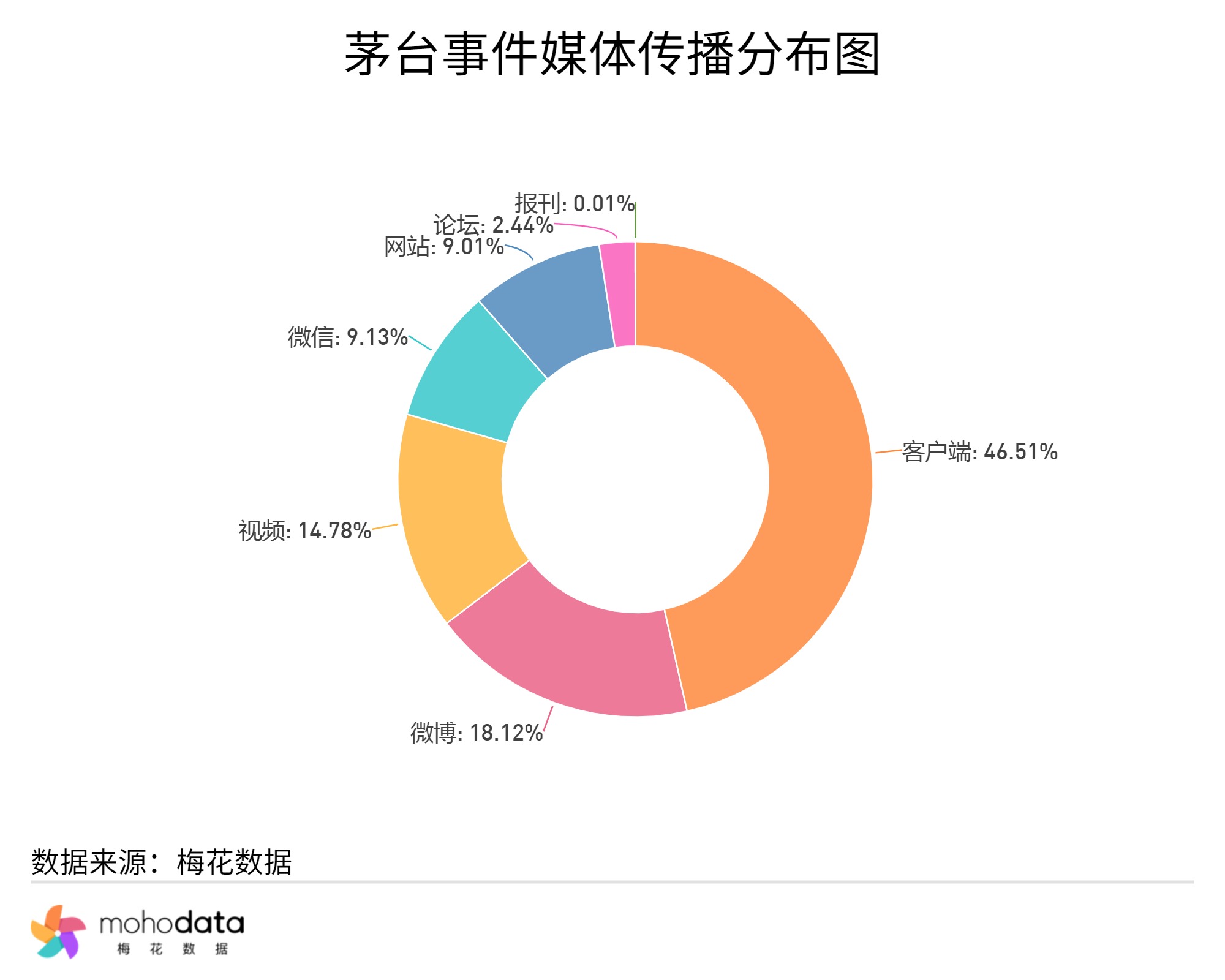 其中信息来源分布图如下图所示,声量主要集中在客户端,客户端占比46.51%,微博占比18.12%,视频14.78%,其他信息来源占比不超过10%。