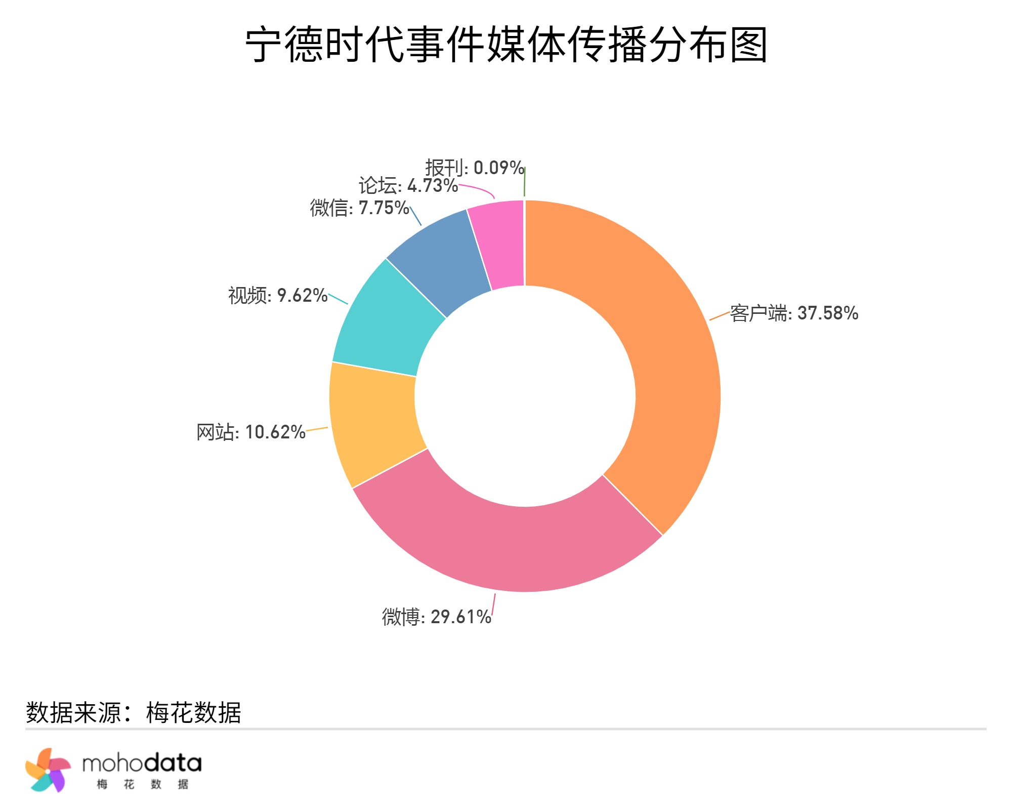 其中信息来源分布图如下图所示,声量主要集中在客户端,客户端占比37.58%,微博占比29.61%,网站占比10.62%,其他信息来源占比不超过10%。