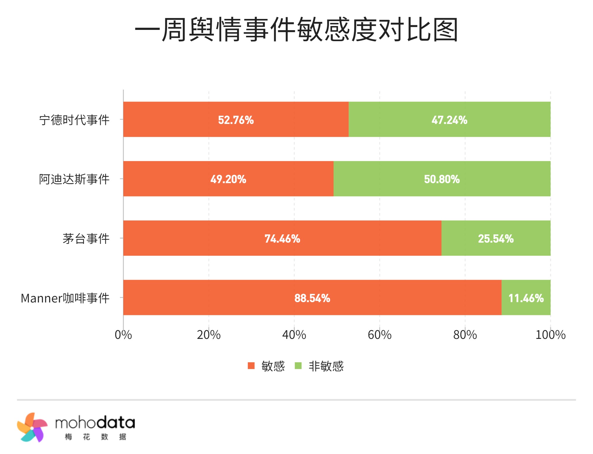 敏感度方面,“Manner咖啡事件”相关的敏感度最高,占比达88.54%,“茅台事件”占比达74.46%, “宁德时代事件”占比达52.76%, “阿迪达斯事件”占比达49.20%。
