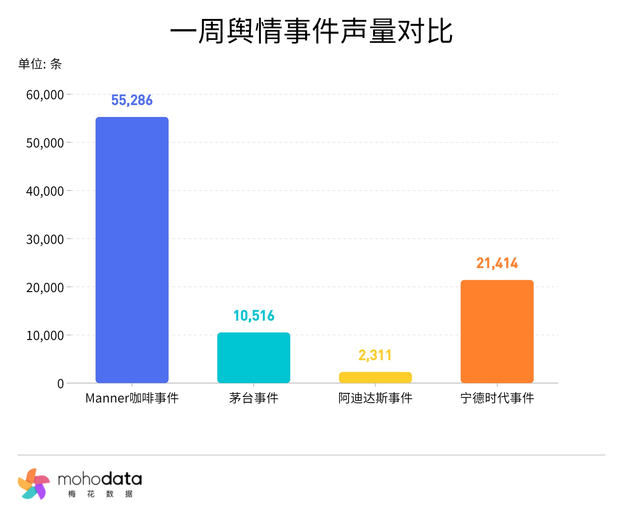 舆情声量方面,监测期间内主要舆情当中,“Manner咖啡事件”声量最高,共监测到舆情声量55286条,其次“宁德时代事件”舆情声量为21414条, “茅台事件”舆情声量为10516条,“阿迪达斯事件”舆情声量为2311条。