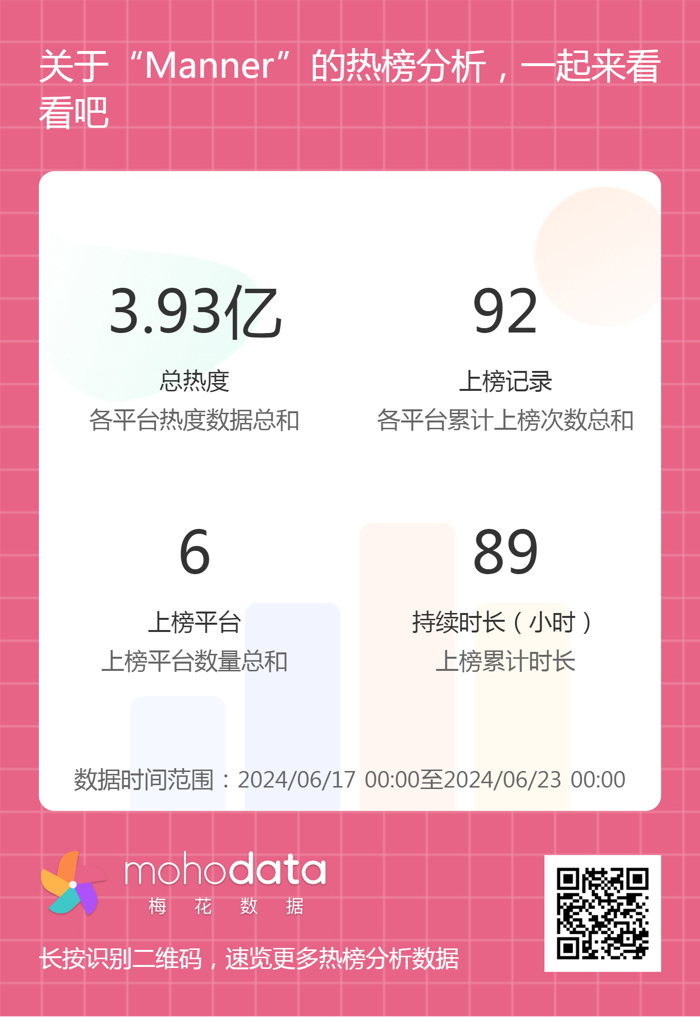 热搜方面,此次Manner咖啡事件相关热搜热度总计3.93亿,上榜记录92次,上榜平台6家,持续时长89小时。详情可扫描以下二维码查看。