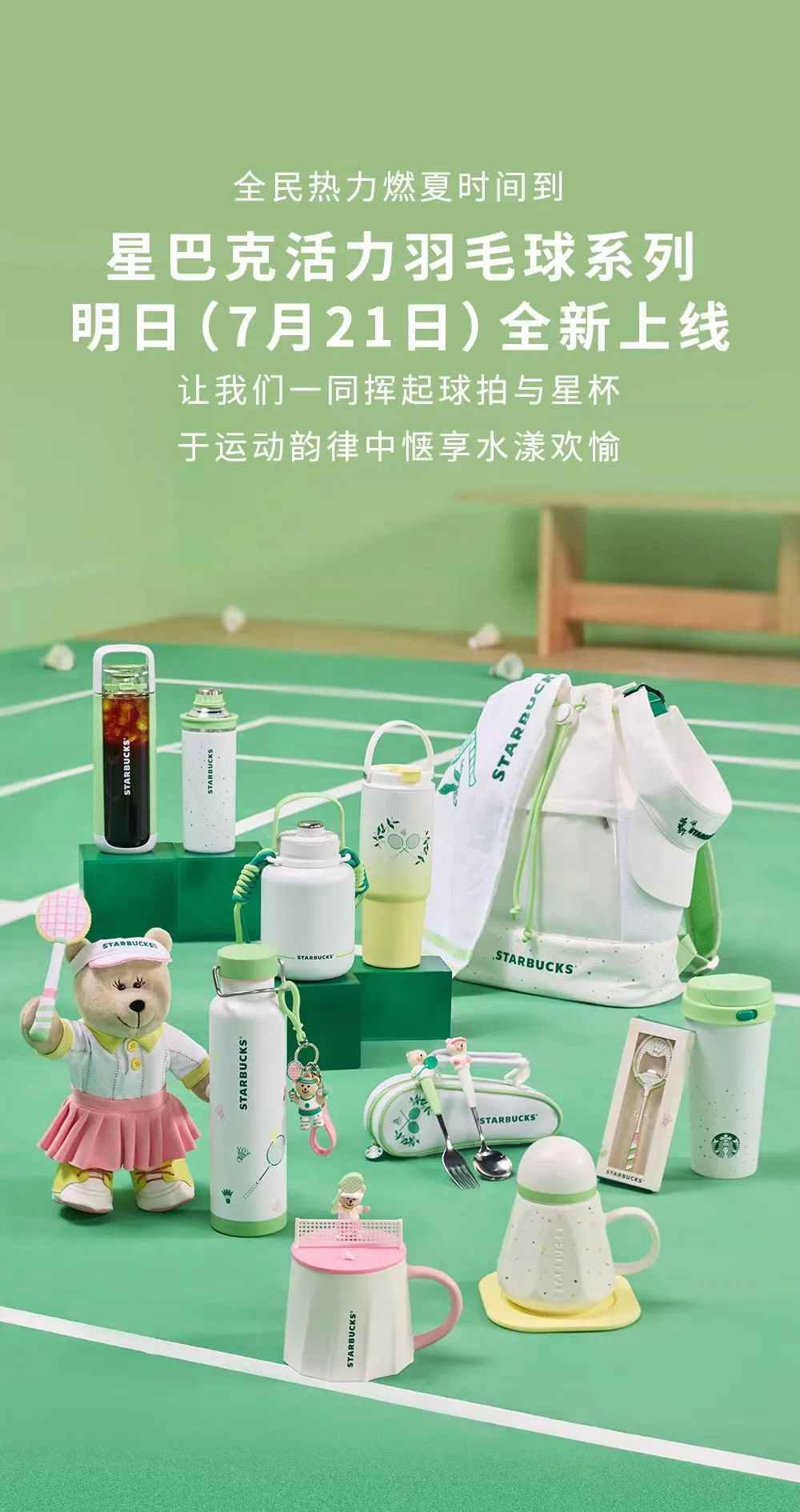 除了这些,星巴克还推出了一系列活力羽毛球主题的商品。不仅有色彩缤纷的羽毛球形状的杯子、餐具,还有同系列设计的挥拍小熊。和包含运动毛巾和运动帽的运动背包组合在一起,看起来怪可爱的,让羽毛球爱好者瞬间心动了。