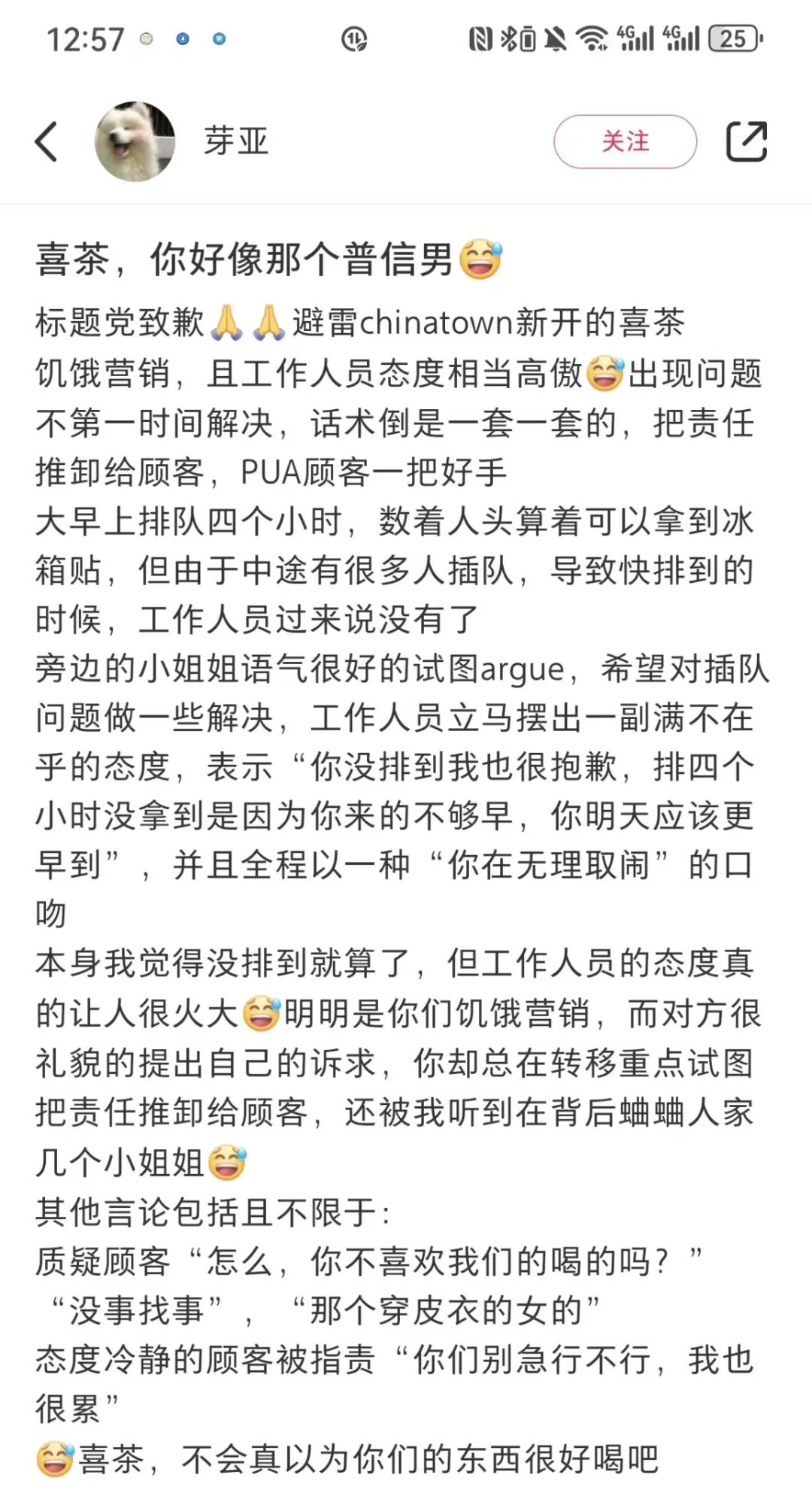 开业首日,喜茶悉尼门店前便迎来了络绎不绝的长队,却因线上小程序的缺席而显得有些混乱。更令人遗憾的是,现场的秩序维护似乎并未跟上步伐,导致出现了插队现象。而喜茶员工对于顾客关于秩序的合理诉求,却显得有些漠然,这种“事不关己”的态度无疑给顾客的体验打了折扣。