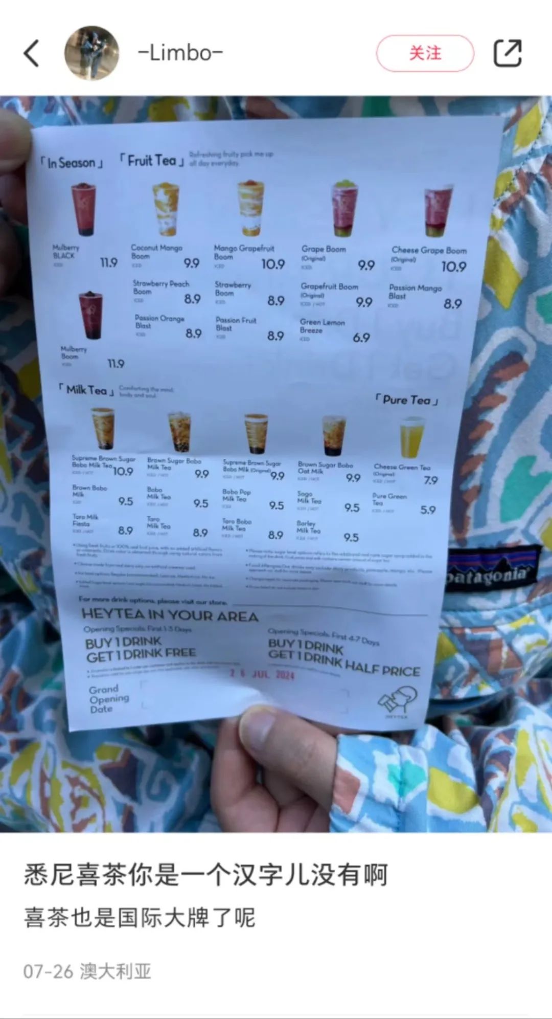 随后,有关悉尼喜茶门店的菜单问题也引起了关注。菜单上仅有英文选项,与其他“出海”的中国茶饮品牌相比,后者通常在菜单上保留中文,以贴近海外华人消费者的情感需求。毕竟,对于身在海外的游子来说,能在异国他乡看到熟悉的品牌和亲切的汉字,不仅是一种文化上的慰藉,也是一种情感上的归属感。这种细节上的疏忽,可能会影响到品牌与消费者之间的情感连接。