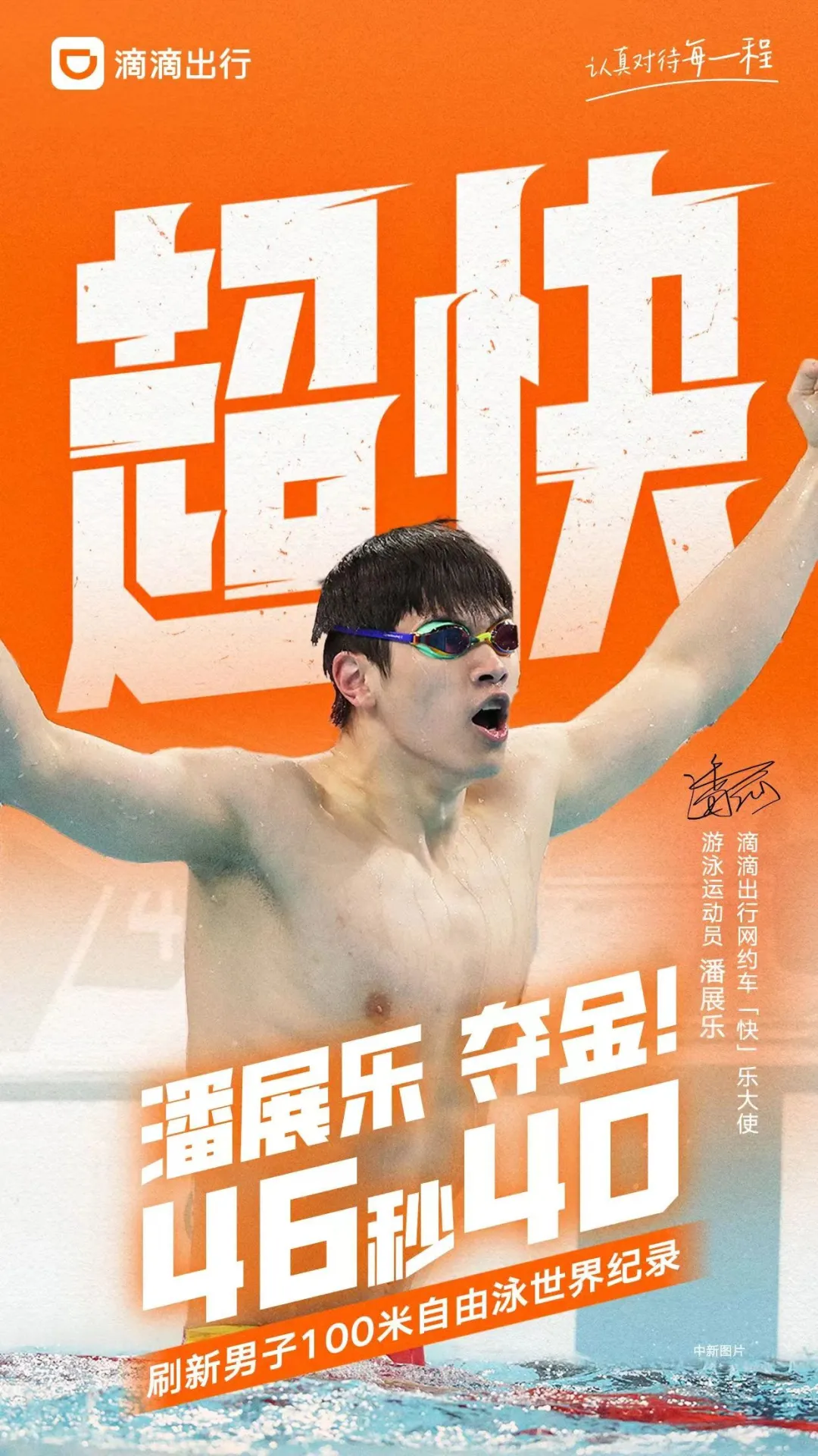 夺冠后的潘展乐,其商业价值如同他的泳池速度一样,迅速飙升,成为市场上的热门人物。8月,他接连成为滴滴出行网约车的“快”乐大使,以及农夫山泉等品牌的代言人。