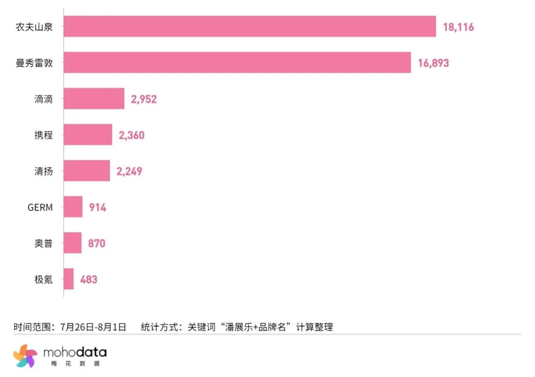 在潘展乐的星光引领下,各大品牌正借助他的人气和影响力,积极展开一系列引人注目的营销传播活动。下图是目前的主要代言品牌传播概况,其中农夫山泉与曼秀雷敦已围绕潘展乐展开重点传播活动。特别是农夫山泉,在经历一系列敏感事件后,正迫切寻求通过潘展乐的形象来重塑其品牌形象,其传播力度尤为显著。同时,滴滴、携程、清扬等品牌的营销传播也显示出相当的规模和影响力。