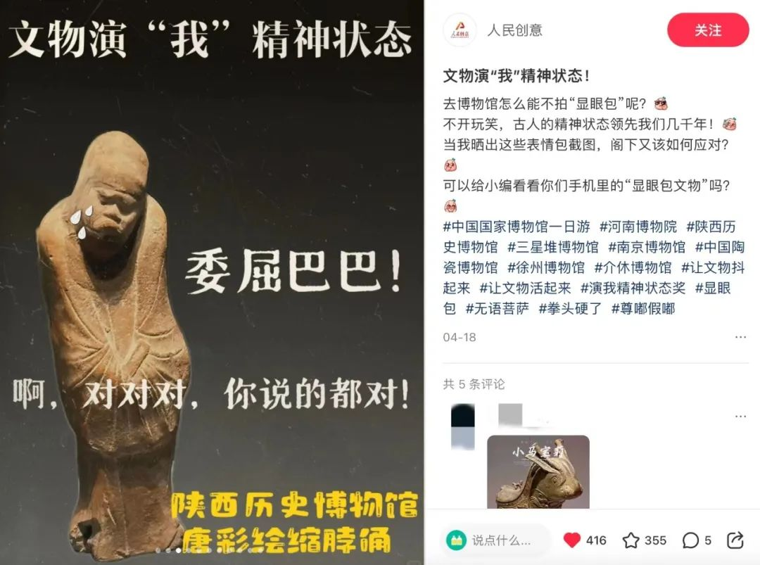 陕西历史博物馆的唐代彩绘陶缩脖俑,因其皱眉瘪嘴的造型,成为趣味表情包,被配上文字“委屈巴巴”“你说的都对”。
