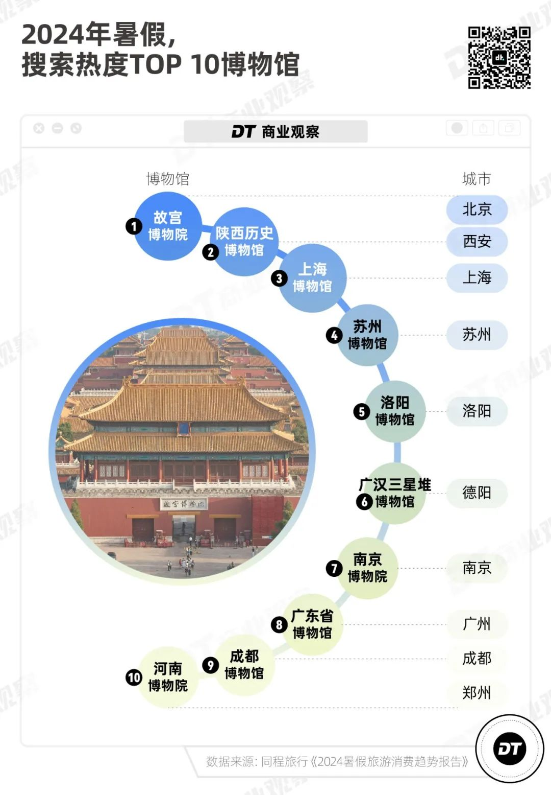 同程旅行发布的《2024暑期旅游消费趋势报告》显示,截至7月5日,同程旅行平台搜索指数较高的博物馆前十名依次为——