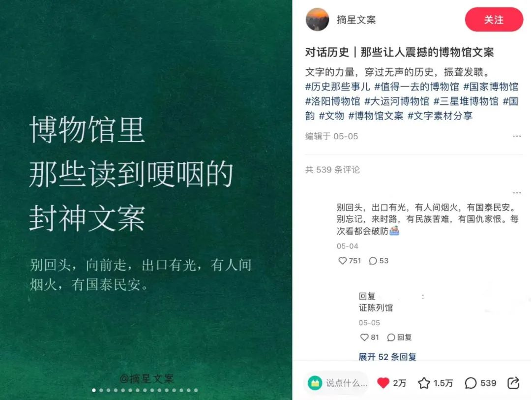 例如小红书博主 @摘星文案 发布了不同博物馆的展览结语,“生活爱出难题,但时光总有答案”“请笃信:痛终有时,爱必将至”“擦清历史的镜子,走好未来的路”等,收获了上万的点赞和收藏。