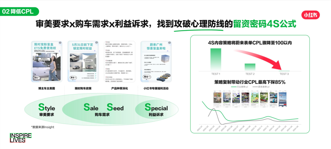 首先是留资环节的降本增效。蔚来深谙在小红书好内容才能带来好流量的道理,探索出了一个车企可复制的「留资密码 4S 公式」。优质笔记再配合信息流加投,CPL 下降过半,成功把高达千元的线索成本打下来。