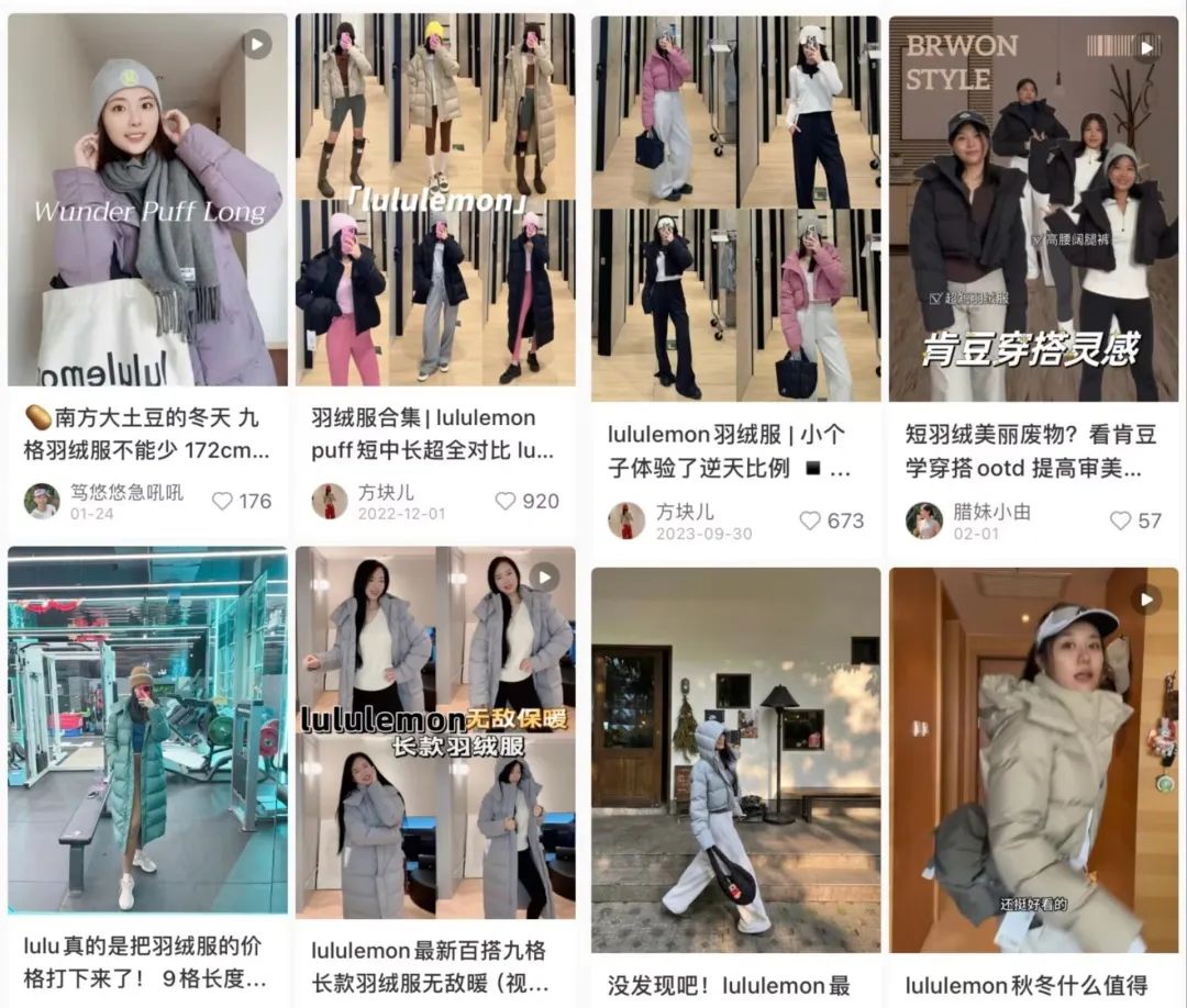 去年冬天,lululemon就是这么把三格羽绒服卖爆的。为了研究消费者的购买动机,lululemon先看了一下消费者都在小红书搜什么。结果发现小红书用户搜关键词的时候,会具体到“lululemon羽绒服三格”、“lululemon羽绒服九格”这么细的颗粒度。