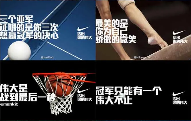 在中国,每当有运动员创造佳绩,耐克就发布“活出你的伟大”主题海报,海报没有任何奥运元素,但人们一眼看去,一定会认为这是奥运海报。