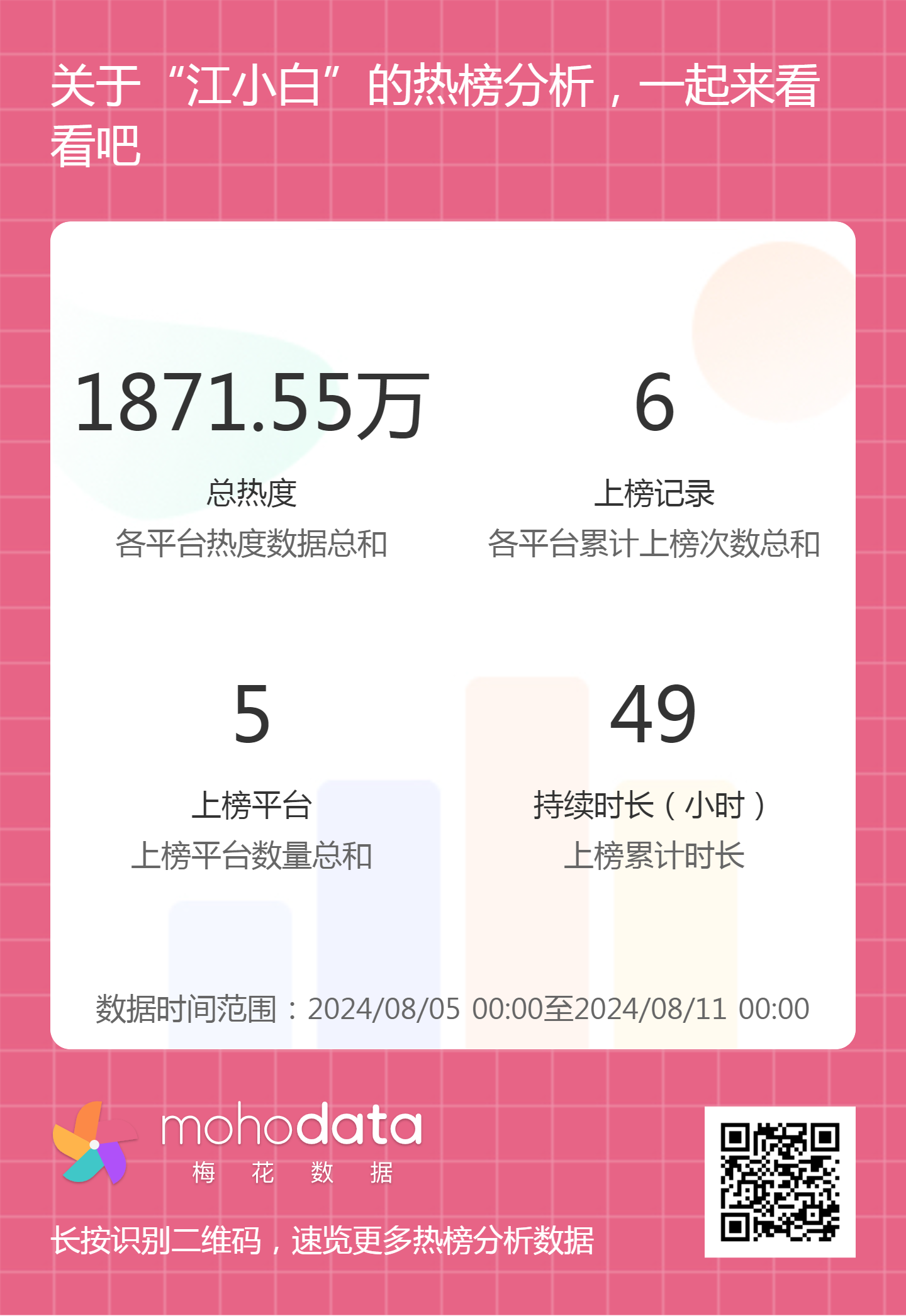 热搜方面,此次江小白事件相关热搜热度总计1871.55万,上榜记录6次,上榜平台5家,持续时长49小时。详情可扫描以下二维码查看。