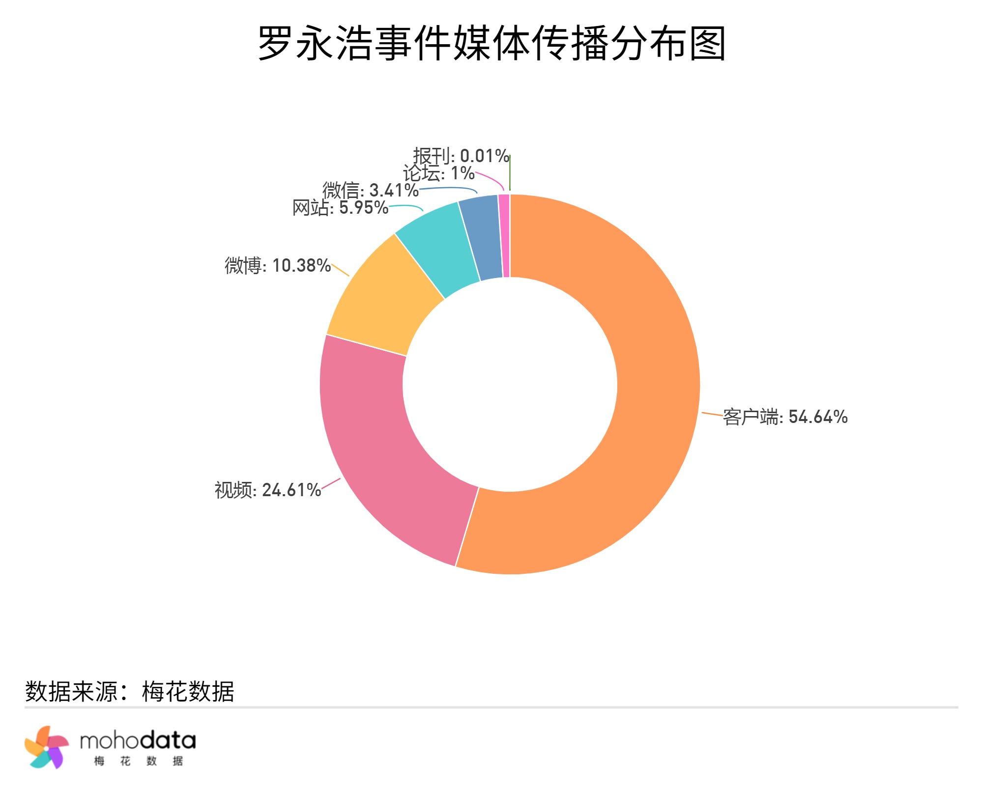 其中信息来源分布图如下图所示,声量主要集中在客户端,占比54.64%,视频占比24.61%,微博占比10.38%,其他信息来源占比不超过10%。