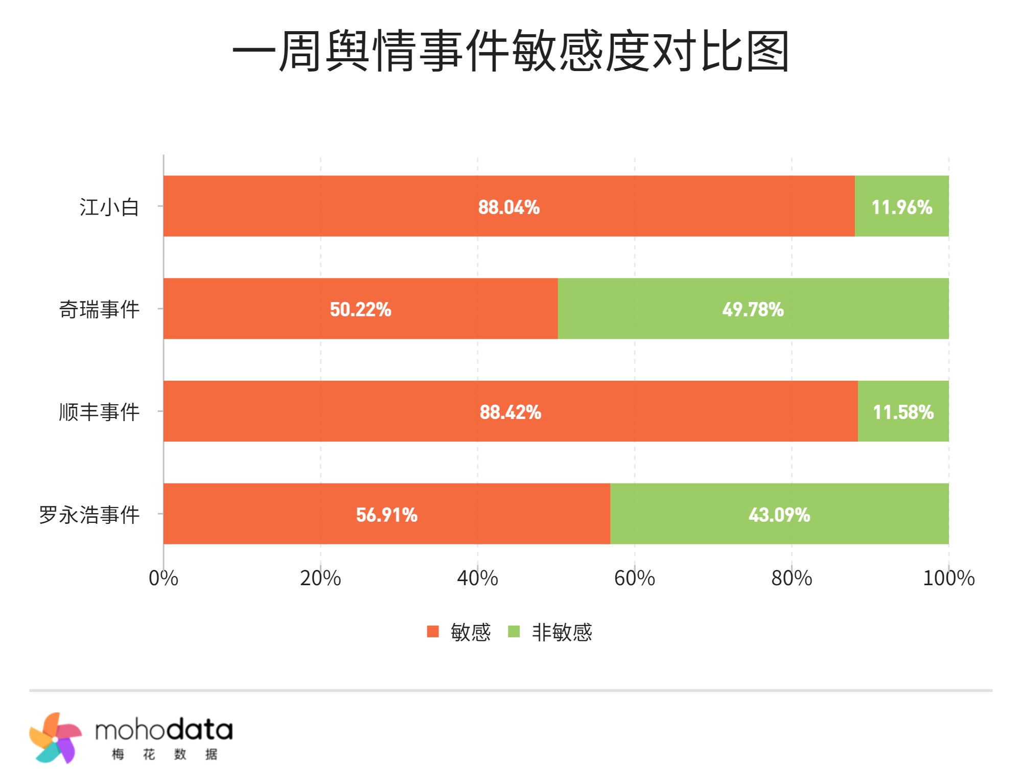 敏感度方面,“顺丰事件”相关的敏感度最高,占比达88.42%,“江小白事件”占比达88.04%, “罗永浩事件”占比达56.91%, “奇瑞事件”占比达50.22%。