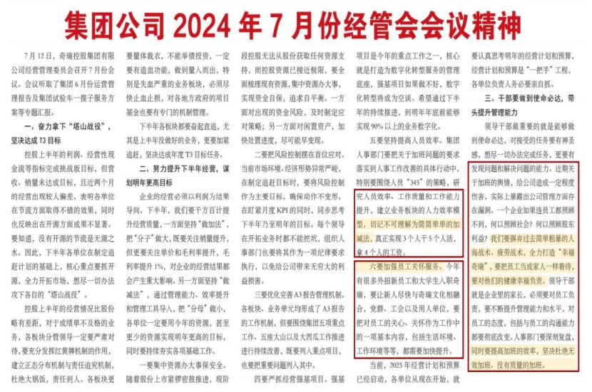 近日,网络流传一份奇瑞公司2024年7月经管会会议精神的截图,其中提到要“实现3个人干5个人活,拿4个人的工资”。上述说法引起各方关注和关于内卷等解读。