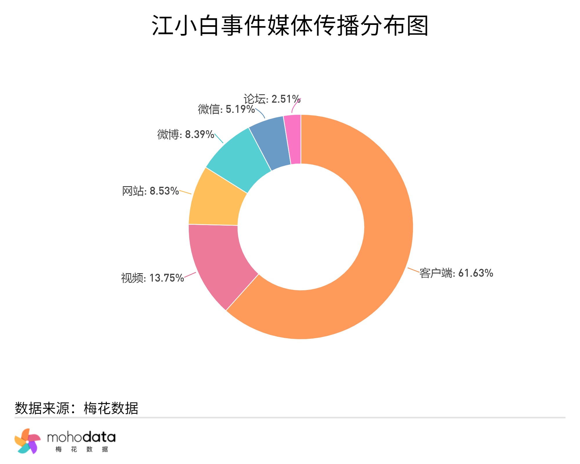 其中信息来源分布图如下图所示,声量主要集中在客户端,占比61.63%,视频占比13.75%,其他信息来源占比不超过10%。
