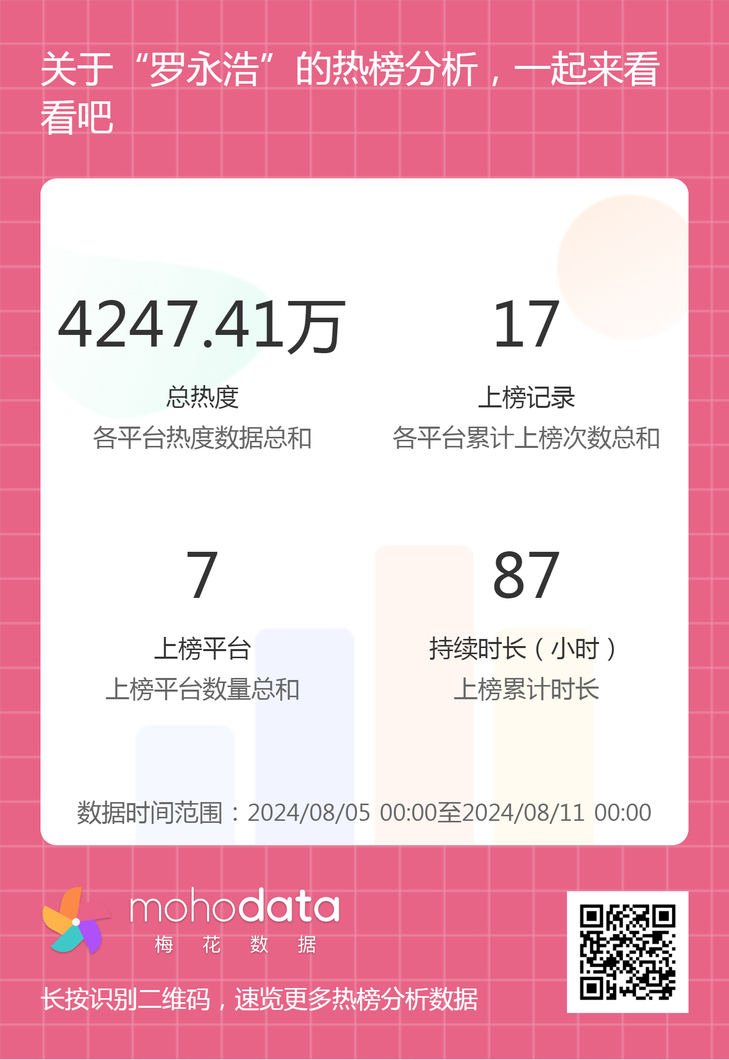 热搜方面,此次罗永浩事件相关热搜热度总计4247.41万,上榜记录17次,上榜平台7家,持续时长87小时。详情可扫描以下二维码查看。