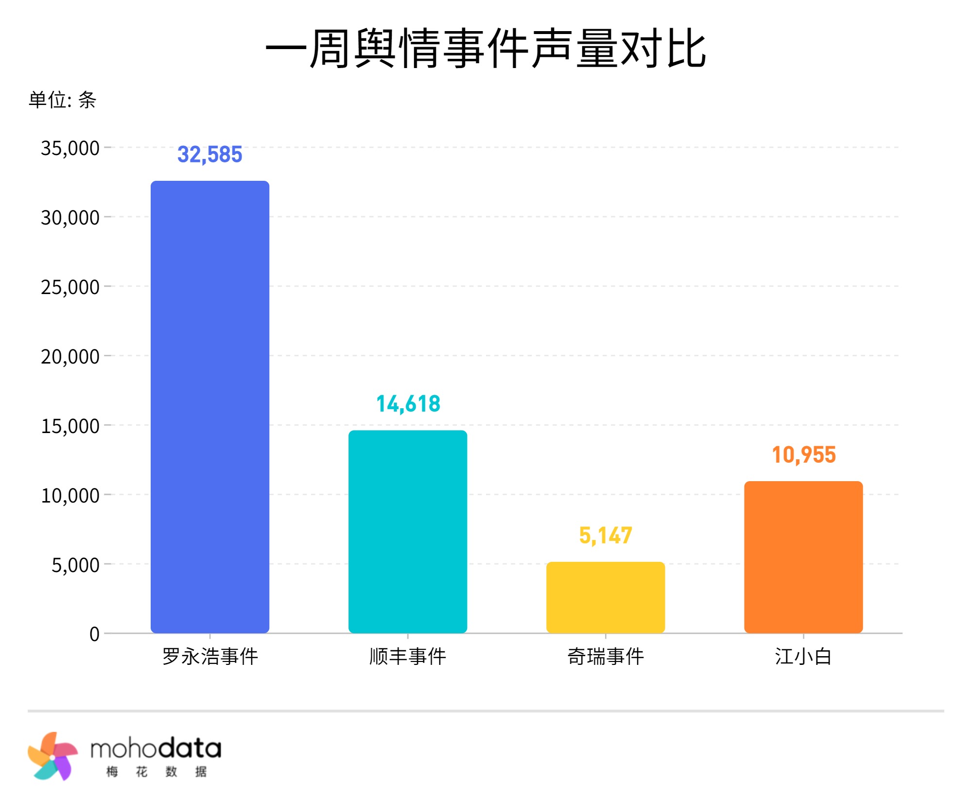 舆情声量方面,监测期间内主要舆情当中,“罗永浩事件”声量最高,共监测到舆情声量32585条,其次 “顺丰事件”舆情声量为14618条,“江小白事件”舆情声量为10955条,“奇瑞事件”舆情声量为5147条。