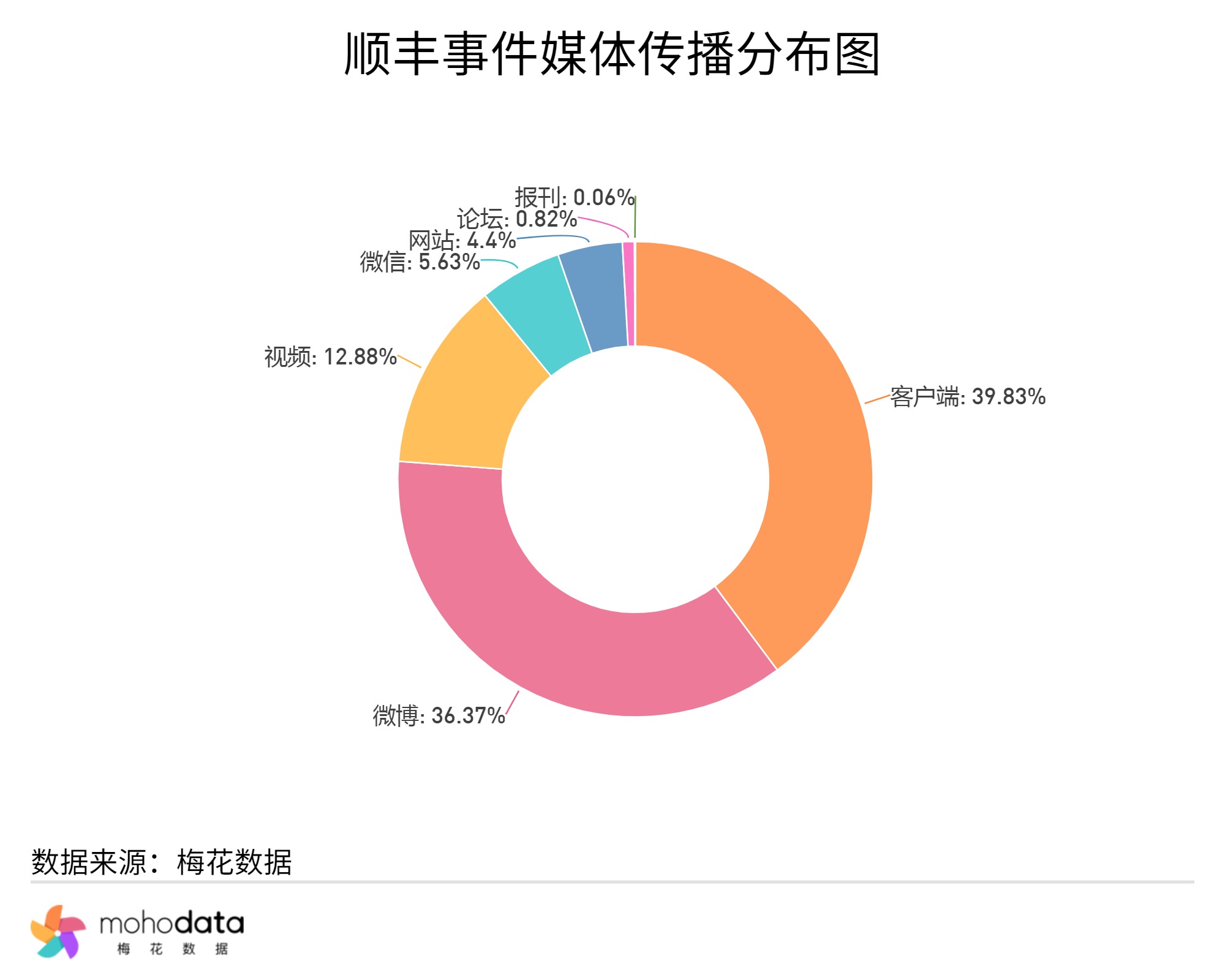 其中信息来源分布图如下图所示,声量主要集中在客户端,占比39.83%,微博占比36.37%,视频占比12.88%,其他信息来源占比不超过10%。