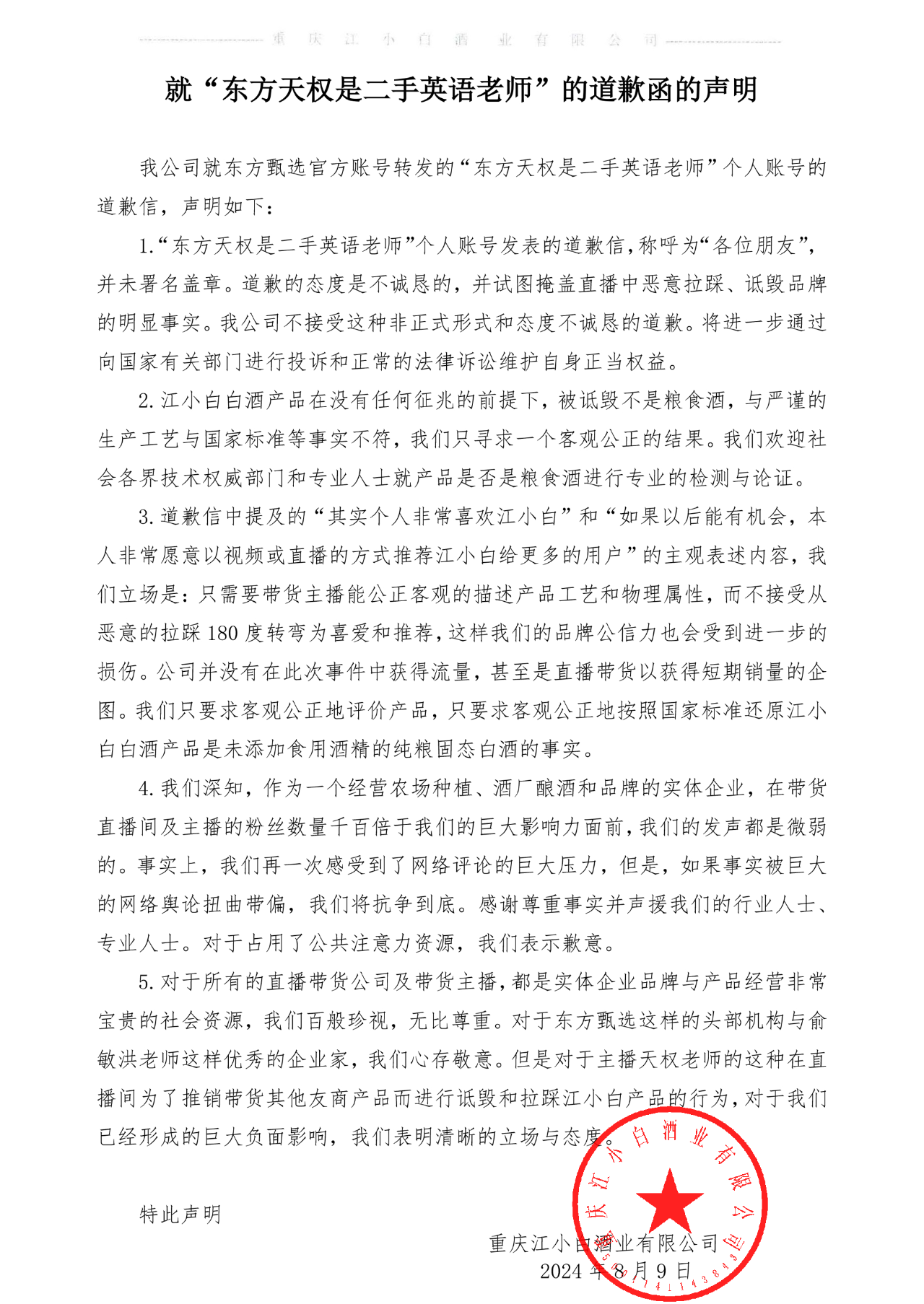 但江小白并未对东方甄选的道歉买账,8月9日23时16分,江小白微信公众号发布《就“东方天权是二手英语老师”的道歉函的声明》称:“‘东方天权是二手英语老师’个人账号发表的道歉信,称呼为‘各位朋友’并未署名盖章。道歉的态度是不诚恳的,并试图掩盖直播中恶意拉踩、诋毁品牌的明显事实。公司不接受这种非正式形式和态度不诚恳的道歉。将进一步通过向国家有关部门进行投诉和正常的法律诉讼维护自身正当权益。”