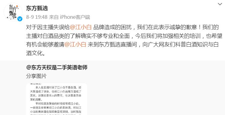 东方甄选官方微博转发其内容并表示:“对于因主播失误给@江小白 品牌造成的困扰,我们在此表示诚挚的歉意!我们的主播对白酒品类的了解确实不够专业和全面,今后我们将加强相关的培训,也希望有机会能够邀请@江小白 来到东方甄选直播间,向广大网友们科普白酒知识与白酒文化。”