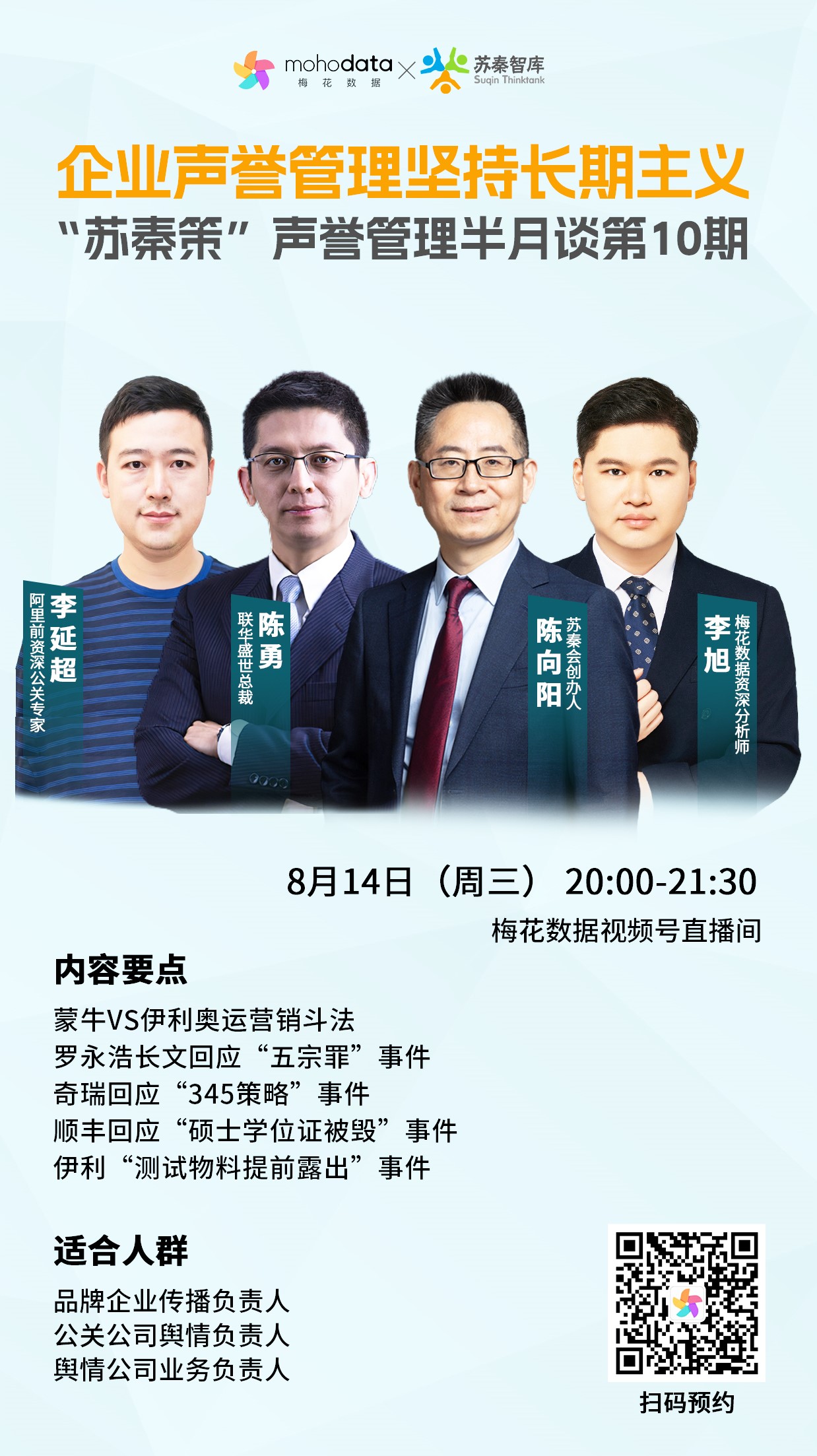新的一周开始,本周我们将举办声誉管理半月谈第十期直播,具体将在8月14日晚8点开播,本次直播将深度解析探讨罗永浩长文回应“五宗罪”事件以及蒙牛和伊利奥运营销表现,欢迎查看文末图片,提前预约。