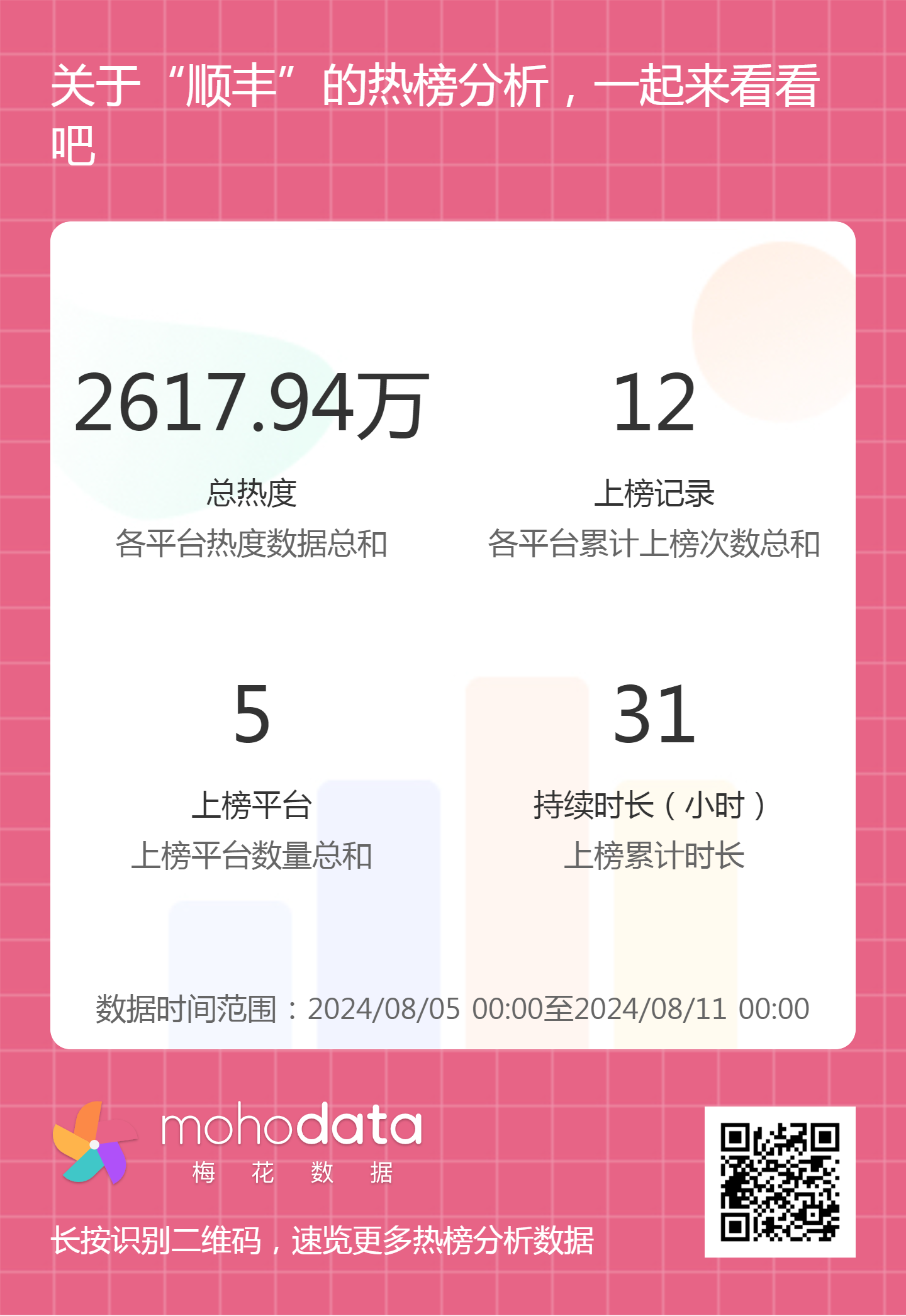 热搜方面,此次顺丰事件相关热搜热度总计2617.94万,上榜记录12次,上榜平台5家,持续时长31小时。详情可扫描以下二维码查看。