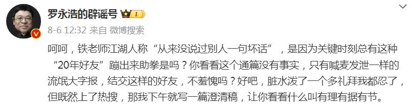 8月6日,罗永浩转发并表示:“通篇没有事实,只有喊麦发泄一样的流氓大字报。好吧,脏水泼了一个多礼拜我都忍了,但既然上了热搜,那我下午就写一篇澄清稿,让你看看什么叫有理有据有节。”