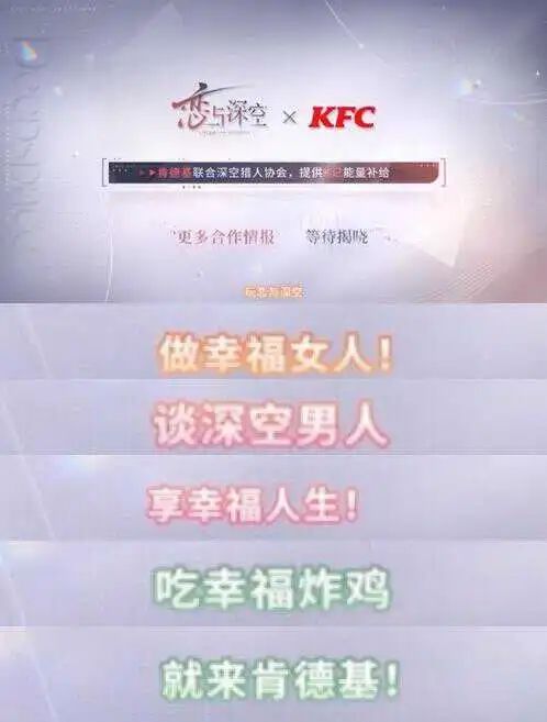 联动双方先是发布了联名宣传视频,开启一波宣发为舆论造势,打着“玩恋与深空,做幸福女人”“谈深空男人,享幸福人生”“吃幸福炸鸡,就来肯德基!”的旗号,诚邀猎人小姐光临肯德基。