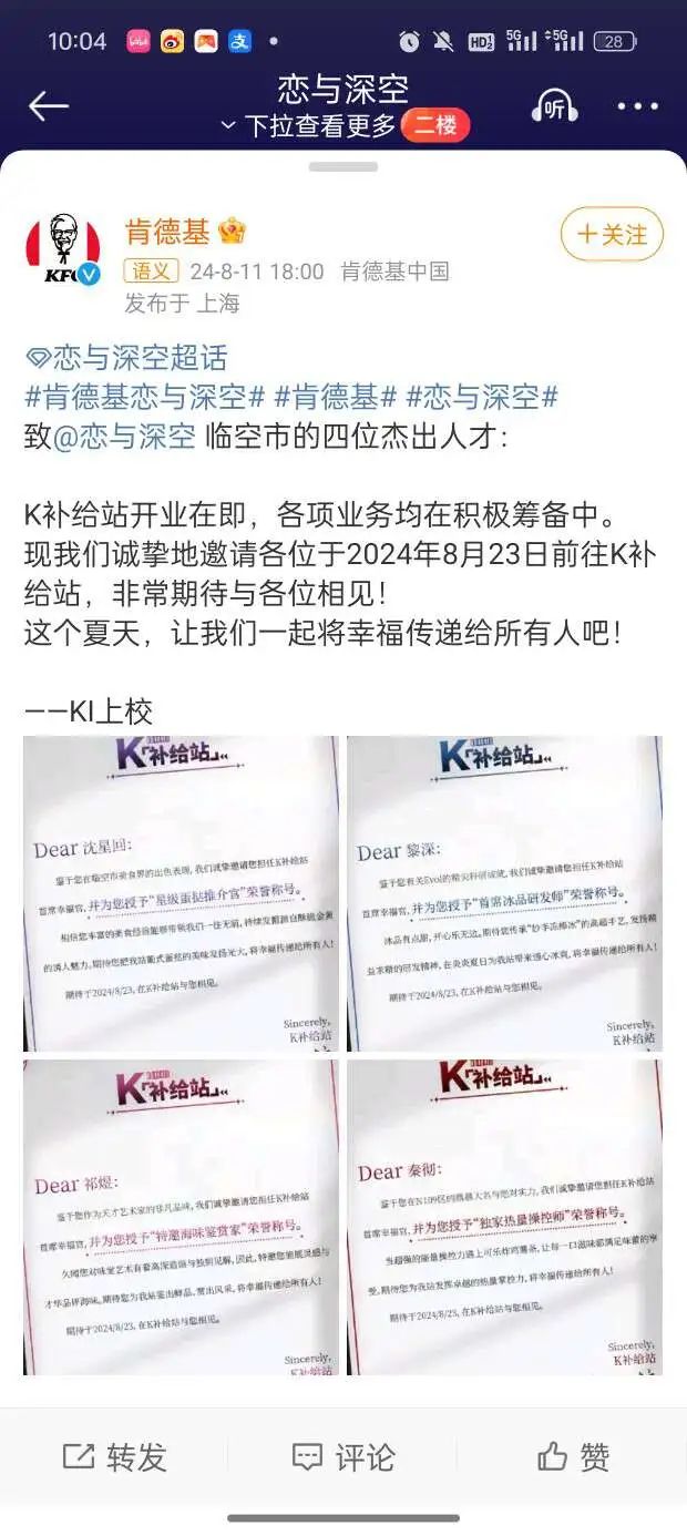 8月11日,肯德基官方和恋与深空发文宣布开启联名活动。