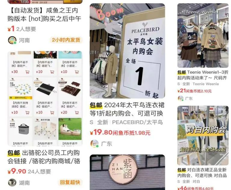 比如,服饰品牌经常会在换季时进行员工内购,以非常便宜的价格清仓过季商品。如今,这样的内购也因为闲鱼而变得半公开。