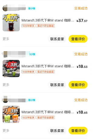 比如,她想在连锁咖啡店点一杯咖啡,她会先在闲鱼上搜索是否有该品牌的代下单卖家——只要告诉他/她在哪个门店,想要什么咖啡,等卖家改价之后再下单,就能以2折左右的价格买到咖啡,“(整个过程)没有比直接下单慢多少。”