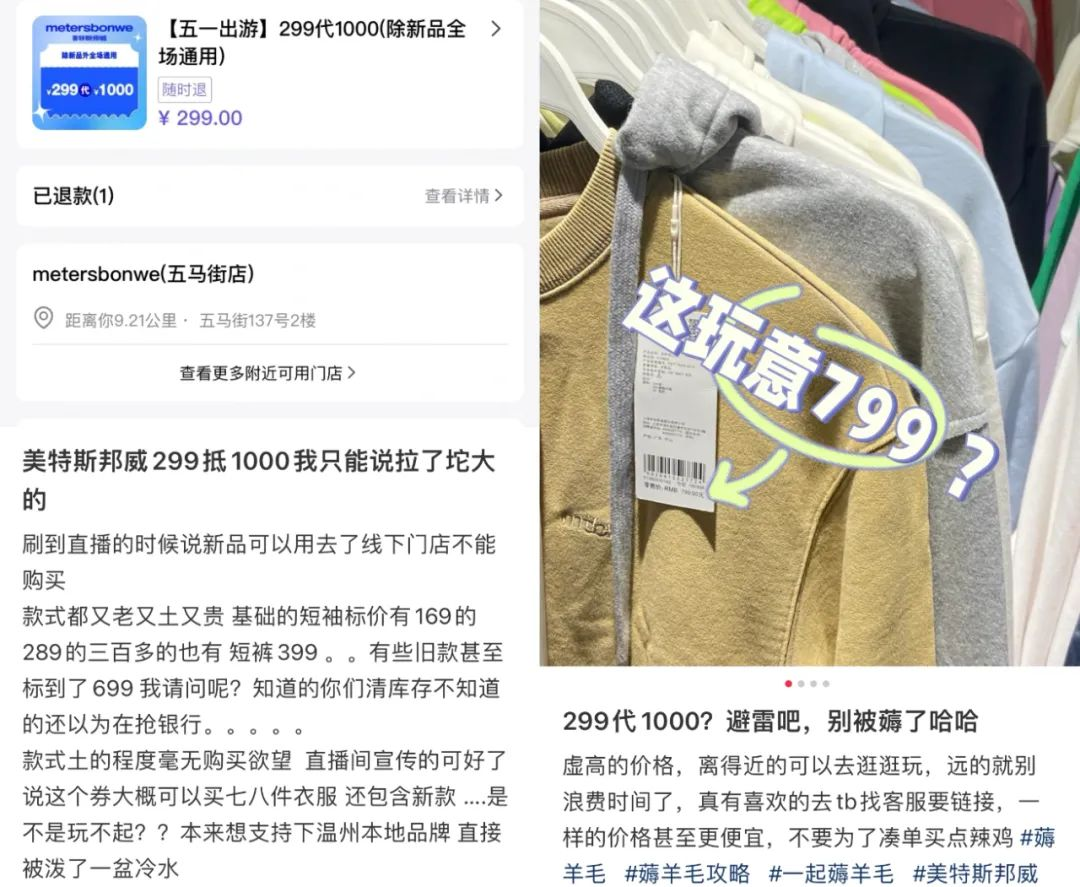 一位消费者表示,女装T恤吊牌价一百五六十,实际买下来均价六七十,便宜的核心要义是“看你怎么凑”;还有人拿出了做数学题的劲头,“绞尽脑汁地凑299代1000的优惠,最后以340元拿下七件的战绩满意离开”。