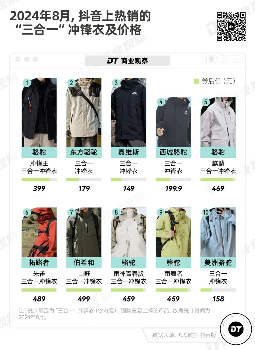 以三合一冲锋衣(带内胆)为例,美特斯邦威的华夏之壳-觅境冲锋衣,折后价449元,而骆驼抖音销量最高的三合一冲锋衣,折后价仅为399元,更不要提1688上价格更低的厂货。