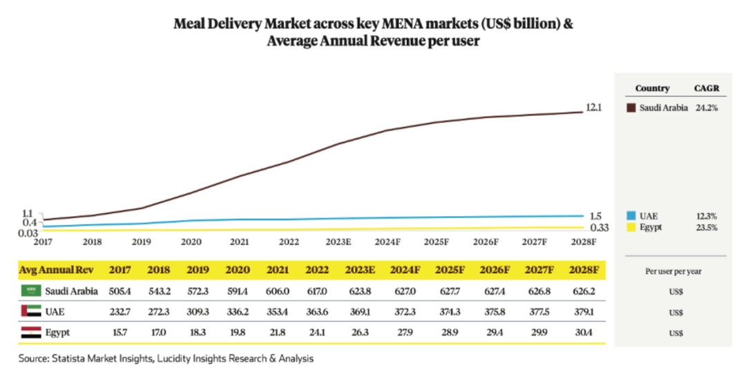 但是,沙特阿拉伯ARPU(每用户平均收入)较高。上述报告还指出,2022 年,沙特阿拉伯的每用户年平均收入 (ARPU) 超过600美元,是埃及平均收入的25.6倍多,是阿联酋平均收入的1.7倍。显然,沙特阿拉伯的消费者愿意在外卖上花费更多。