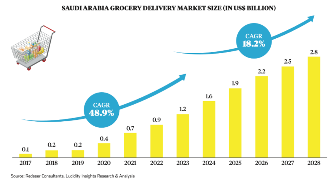外卖服务正在向杂货配送服务转变。上述报告指出,目前,沙特阿拉伯餐饮外卖占据了 88% 的市场份额。但预计到 2028 年,沙特阿拉伯的杂货配送市场将达到28亿美元,年复合增长率高达18.2%,这一增长速度超过了餐饮配送市场 6% 的年复合增长率。