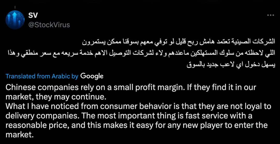 一位自我介绍为“美国和沙特市场投资者”的中东用户说,“中国公司依赖薄利多销。如果他们在我们(沙特)的市场找到机会,可能会继续经营。通过消费者行为,我注意到他们对配送公司没有忠诚度,最重要的是服务速度快且价格合理,这使得任何新进入者都能轻松进入市场。”