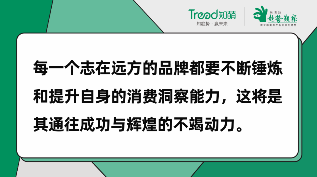 因此,每一个志在远方的品牌都要不断锤炼和提升自身的消费洞察能力,这将是其通往成功与辉煌的不竭动力。