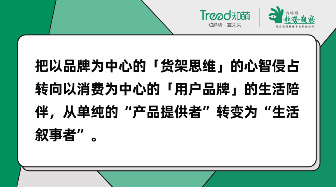 过去,品牌成功的秘诀似乎在于选定一个新品类,然后在这个领域内不断巩固自己的地位,通过强调领先地位和知名度来塑造品牌形象。然而,随着消费者行为的日益复杂和多样化,这样的策略已经显得力不从心。如今的品牌只有转变思维,把以品牌为中心的「货架思维」的心智侵占转向以消费为中心的「用户品牌」的生活陪伴,从单纯的“产品提供者”转变为“生活叙事者”,通过内容营销重新塑造品牌意义,为消费者带来真正可感知的体验。