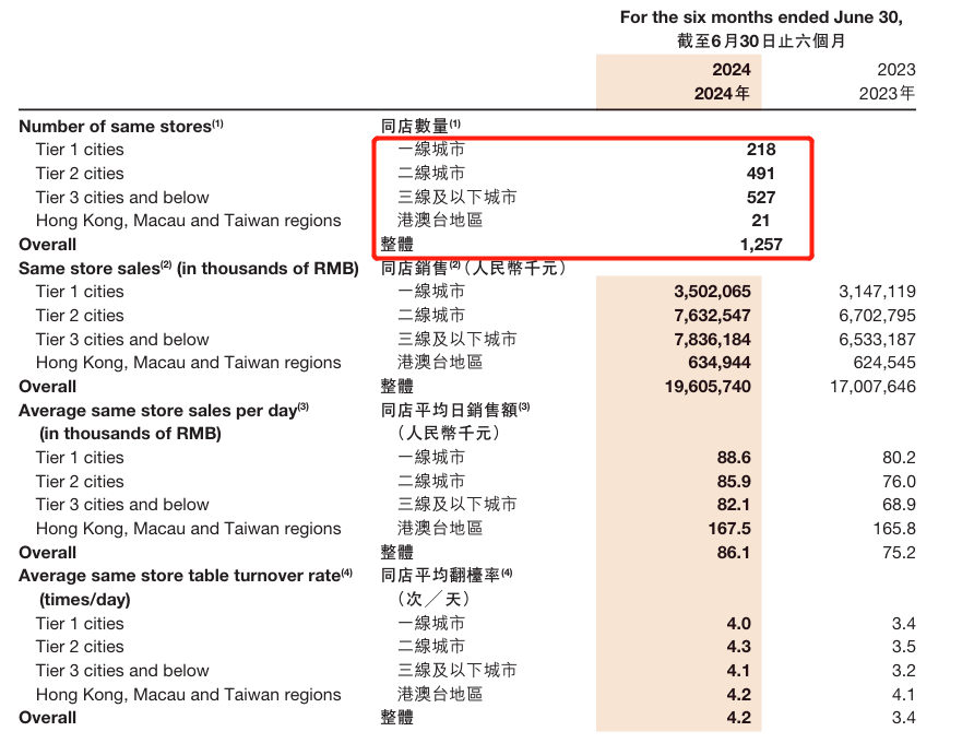 此外,海底捞的门店布局也有明显变化,曾经躬耕于一二线市场的海底捞早就已经在低线城市遍地开花。海底捞2024年中期报告显示,截至目前其在三线及以下城市开店527家,数量多于一线城市和二线城市。