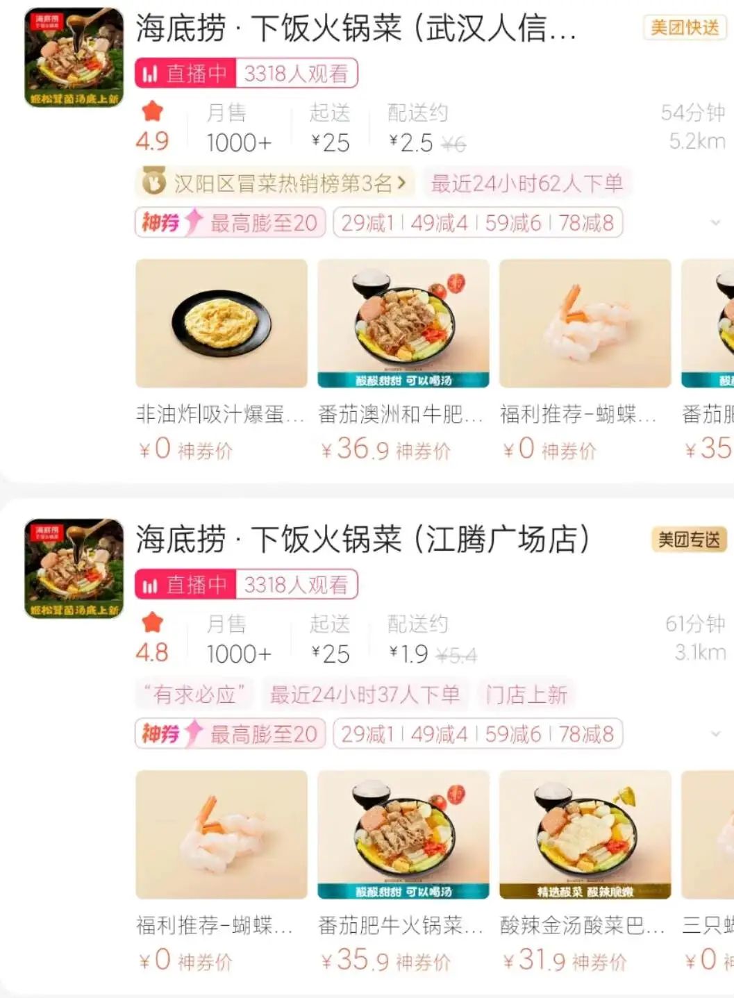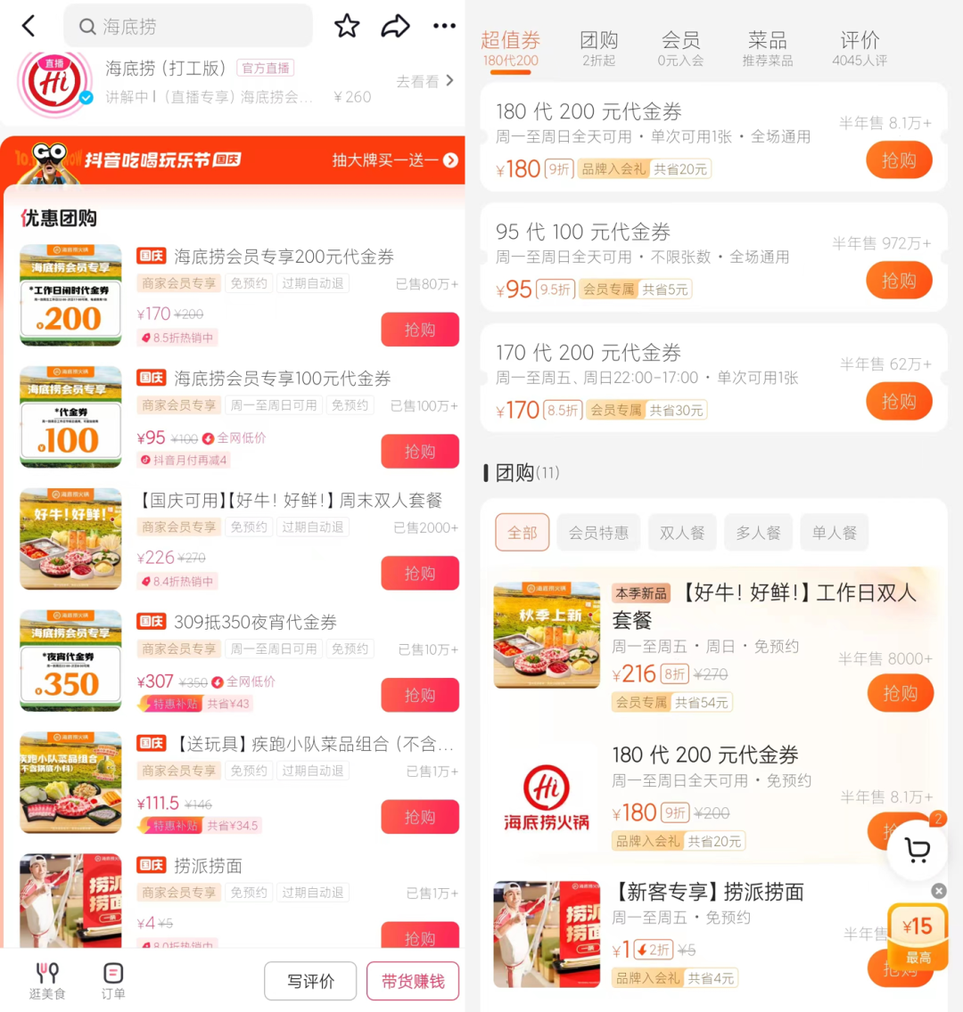 最近以来,海底捞在美团、抖音等本地生活电商平台上推出了很多低价套餐和代金券。