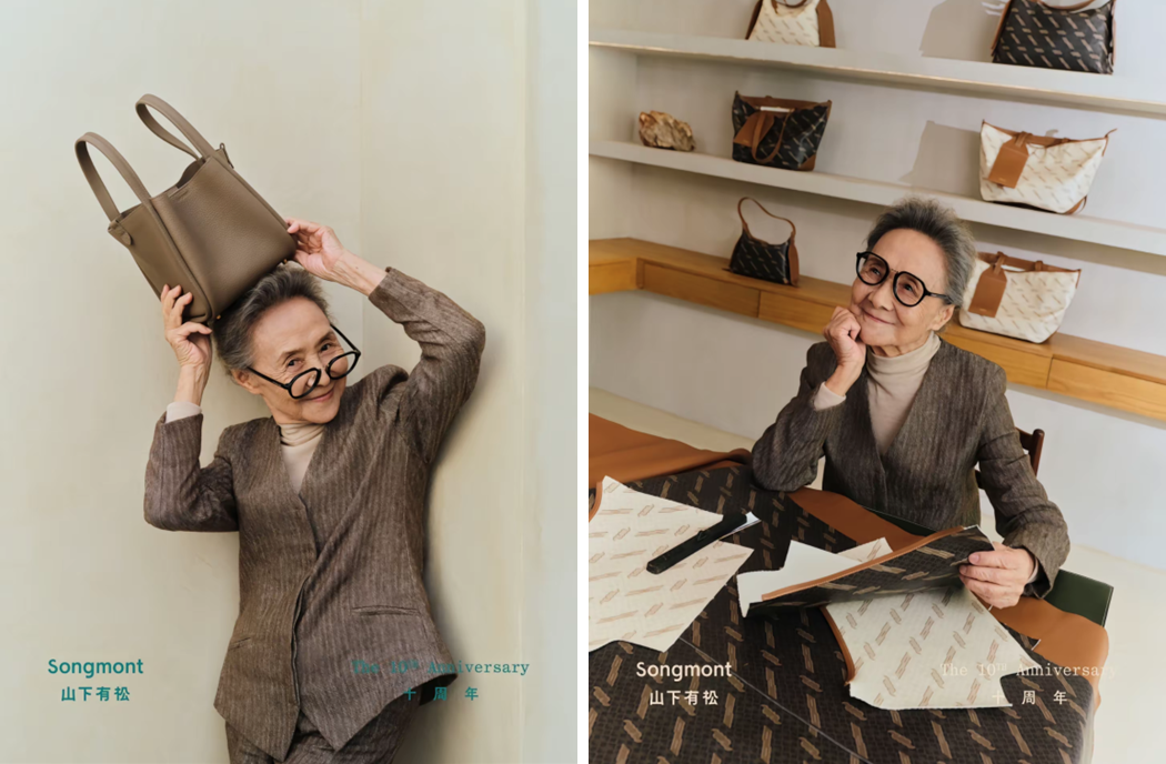2023年,本土包袋品牌Songmont山下有松在品牌十周年庆期间展开系列主题营销,其中,与品牌挚友吴彦姝的合作,用户反响热烈。海报中,吴彦姝一次性打破了大众对潮流时尚代言人和银发族生活状态的双重刻板印象,她俏皮、可爱、优雅的形象将产品质感与品牌主张表达于无形。