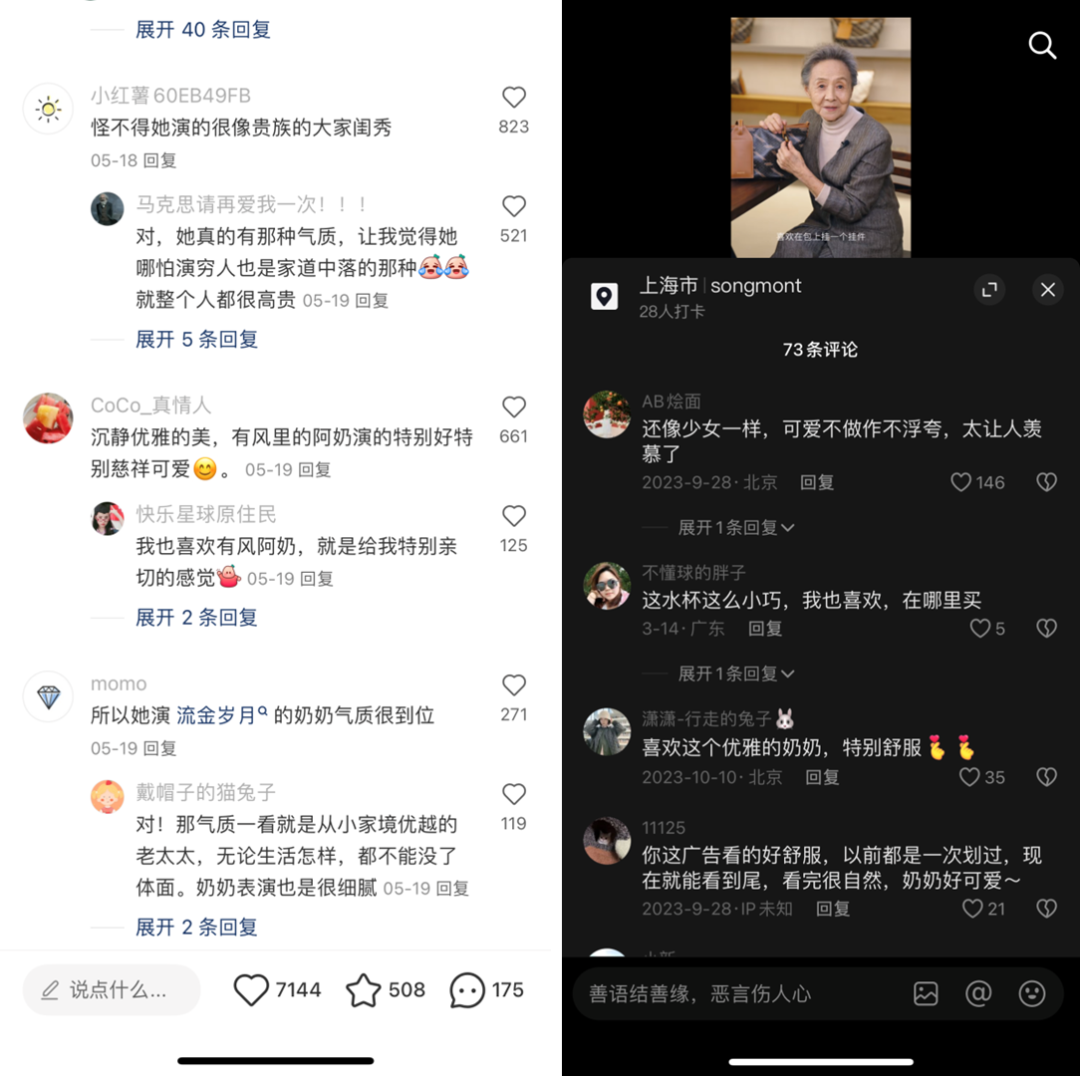 在小红书,姑娘们在感叹“岁月从不败美人”的同时,狠狠吃下奶奶的这记品牌安利。正如网友们所评价的: