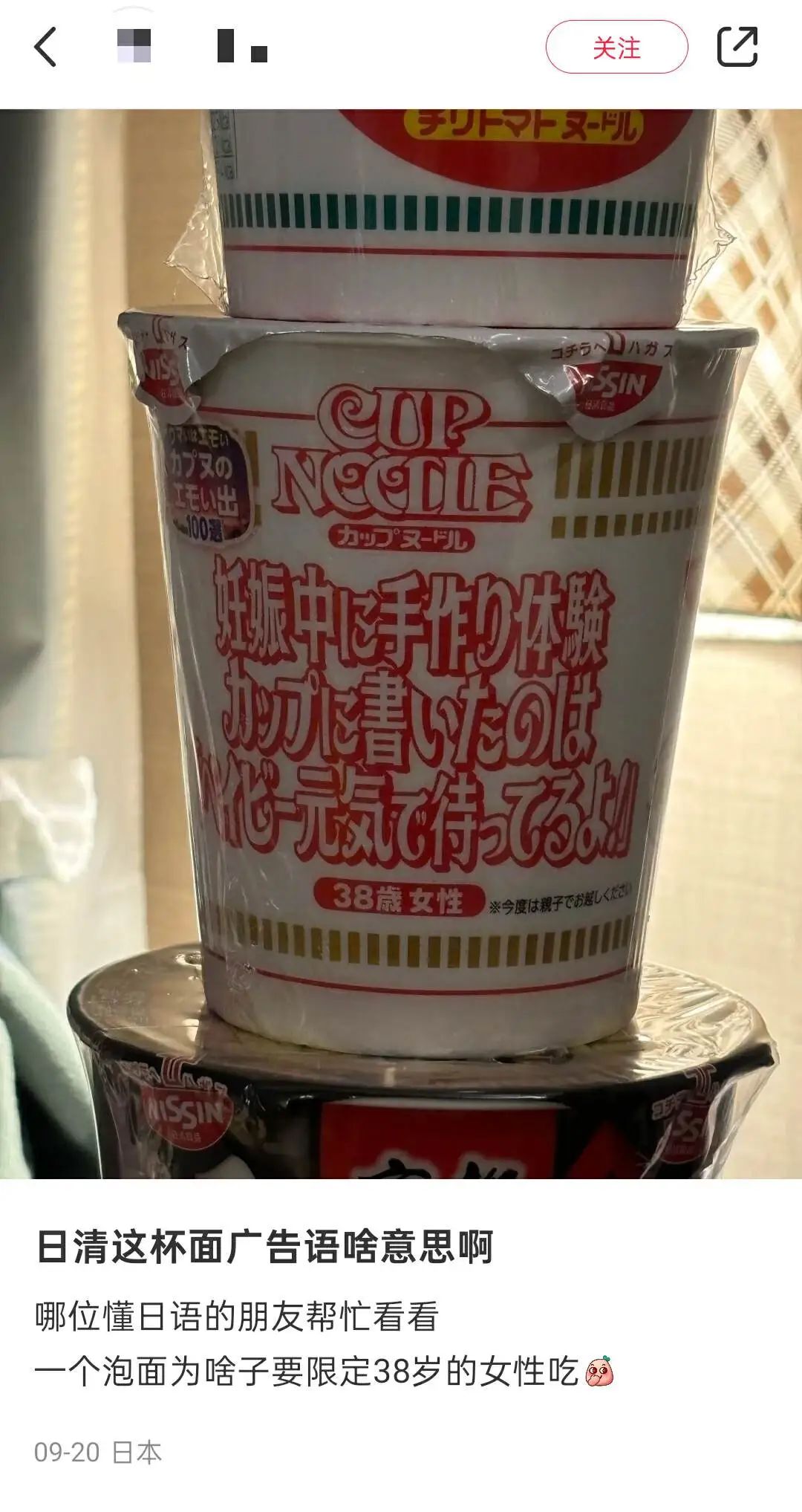 前段时间,一位网友发现日清杯面的杯桶印有一段日语,落款为【38岁女性】,误以为是“仅限38岁女性才能吃”的泡面,看得一头雾水,于是发布在社交媒体上询问网友这是什么意思。